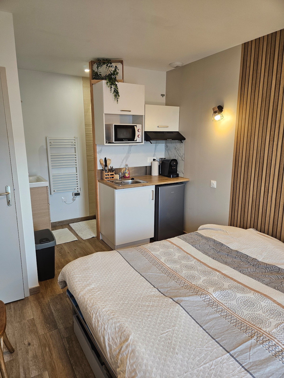 Alloggio Le Mas du Bessin. Facile accesso (4 corsie RN 13), Tra Caen, Bayeux e il mare. Appartamento completamente ristrutturato (2018) in stile contemporaneo, all'interno di una vecchia casa in pietra situata in un piccolo villaggio. Circa 30mq, ideale per una coppia, doppi vetri, riscaldamento elettrico. Ingresso indipendente, al piano terra di una parte dipendenza, tranquillità assicurata. Parcheggio privato e recintato (possibilità di riparo per moto). Ideale per riposare e/o visitare la Normandia…