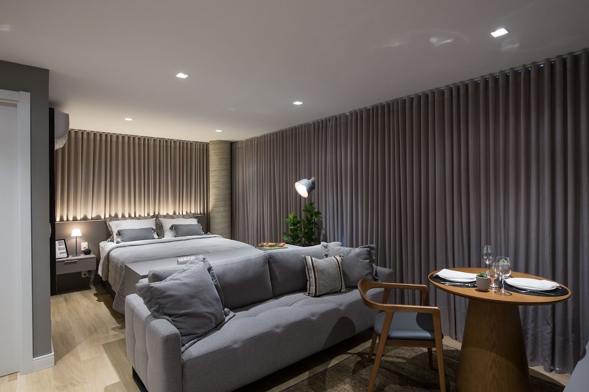 Monolocale moderno e accogliente, arredato da un architetto, situato a un piano alto, con un'ampia vista sulla città, in una zona sicura e tranquilla. Ideale per lavoro o piacere, dispone di Wi-Fi veloce, Smart TV, letto queen-size con tende oscuranti, divano letto, aria condizionata, armadi e cucina funzionale con minibar duplex. Bagno con scalda-asciugamani, doccia con getto potente e asciugacapelli. Palazzo dotato di palestra aperta 24 ore su 24, piscina termale, terrazza sul tetto e lavanderia. A 850 metri da Parcão.