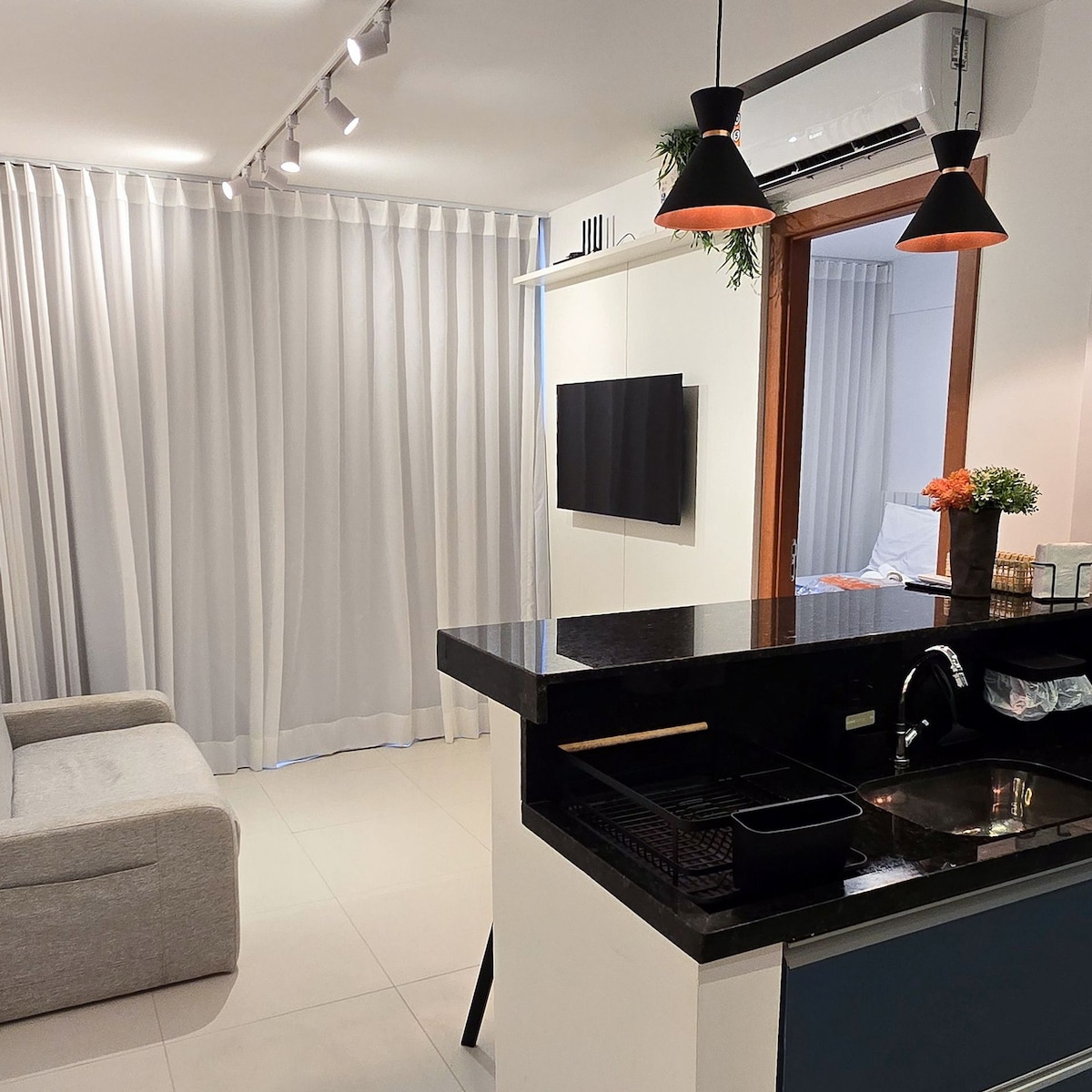Apartamento em prédio novíssimo com: Ar condicionado em todo espaço Wi-Fi alta de performance Smart tv Cozinha equipada Ideal para até 4 pessoas Roupa de cama e toalhas de banho são fornecidas O condomínio conta com: Lavanderia self service Terraço com piscina Espaço home office Academia O Shopping Barra fica apenas 5 min. caminhando Estacionamento: 1 vaga de garagem rotativa Estamos próximos a restaurantes, farmácias, bares, local de shows, mercados e serviços variados.