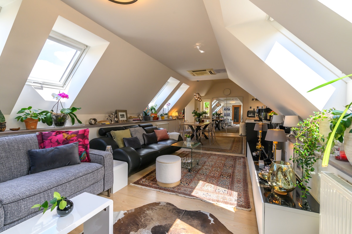 Attico in una zona residenziale di Praga, a due passi dal centro storico. L'appartamento è dotato di tutti i comfort, tra cui una cucina di lusso attrezzata, bagno con vasca e doccia separata, 2 grandi letti matrimoniali a molle e una grande terrazza soleggiata. L'appartamento è stato arredato con cura, riflettendo l'amore del proprietario per l'arte e il design. A 20 minuti di auto dall'aeroporto, parcheggio a pagamento davanti all'edificio e a 300 metri dal centro storico. In breve, un appartamento da sogno.