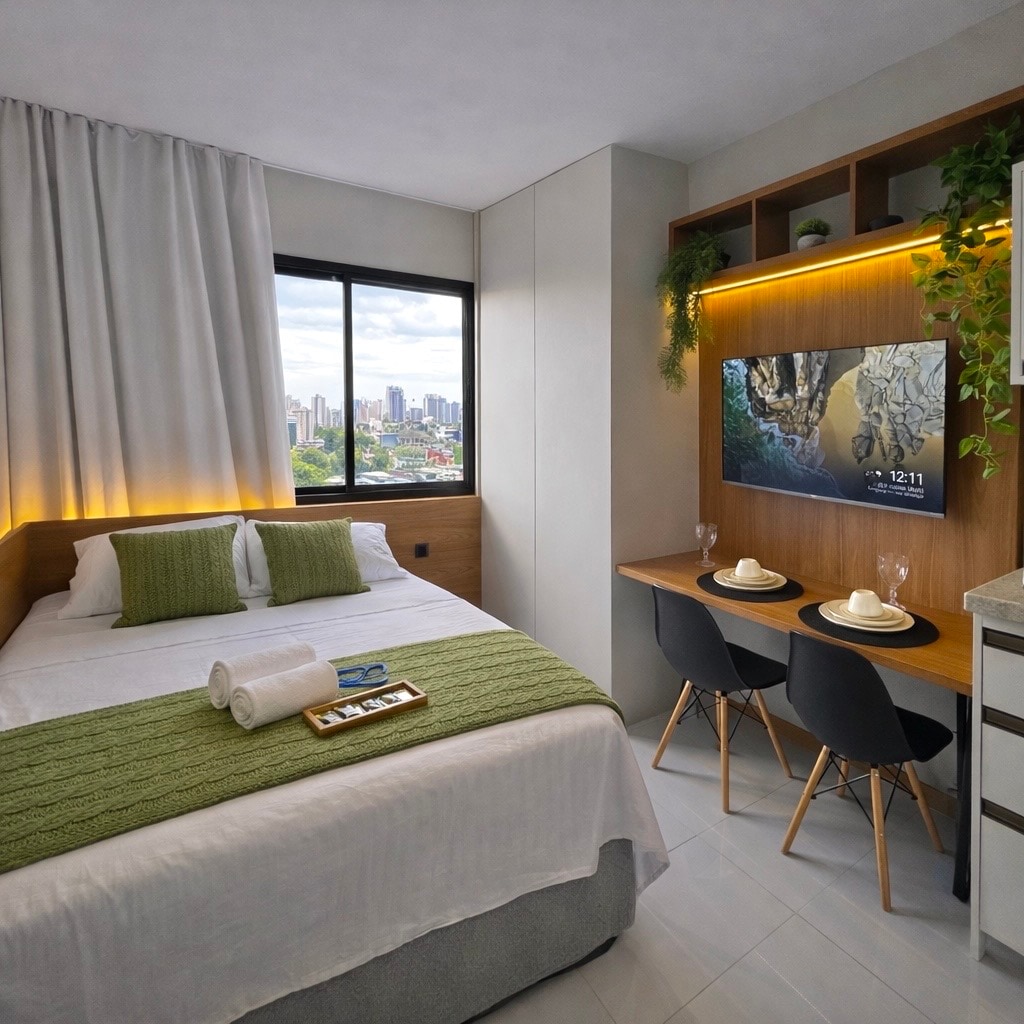 Anfitrião Superhost! Studio boutique no edifício Alive, no bairro Vitória — endereço mais nobre de Salvador. Desfrute piscina com borda infinita e vista incrível para a Baía de Todos os Santos. Moderno e finamente decorado, cama queen confortável, ar-condicionado, Wi-Fi 600 Mbps perfeito para trabalhar ou streaming e estacionamento grátis. A apenas 1,7 km da praia do Porto da Barra, perto de cafés, restaurantes e supermercado a 60m. Conforto, elegância e localização privilegiada em um só lugar.