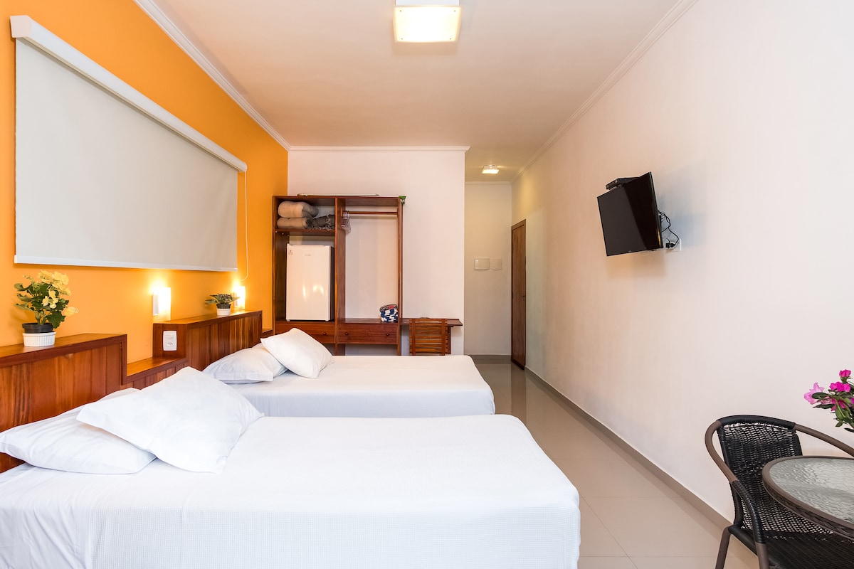 O Quarto Duplo Standard oferece cama de casal e uma cama de solteiro. Equipado com Ar-Condicionado SPLIT, frigobar, TV, guarda-roupa ou armário, mesa de trabalho, Wi-Fi e banheiro privativo completo. Acomoda até 3 pessoas.
