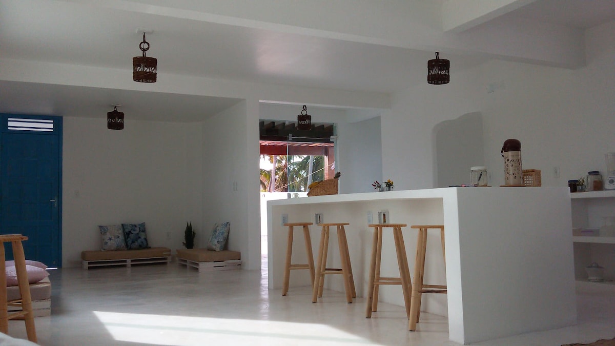 Lembra-se de “Mamma Mia!” e “Antes da meia-noite” com casinhas caiadas de branco de aspecto quadrado, com telhado, portas e janelas azuis brilhantes à beira-mar? Pois bem, essa é um casa com arquitetura grega no litoral brasileiro. Um espaço aconchegante com 4 suítes com cama super king, cozinha, sala, ar condicionado, mobiliada. São 3 suítes com 18 m2 e 1 suíte com 27 m2, com banheira panorâmica e uma agradável varanda, tudo isso a 1 minuto da areia da praia, em um paraíso chamado Flecheiras.