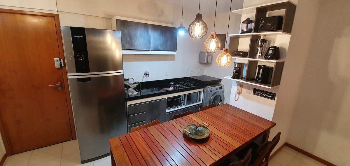 Appartamento per un massimo di 4 persone. Soggiorno con divano letto matrimoniale, tv via cavo con, netflix, wi-fi. Suite con 1 letto matrimoniale e aria condizionata. Biancheria da letto e da bagno a disposizione. Cucina completa. Godetevi questo spazio progettato per trasformare la vostra vacanza al mare in una vacanza da sogno! La vista mozzafiato, la brezza che vi calma, unendo a tutto questo, tutto il comfort di un appartamento funzionale e pieno di buone energie! Venite a vivere questa magia, vi aspetto!
