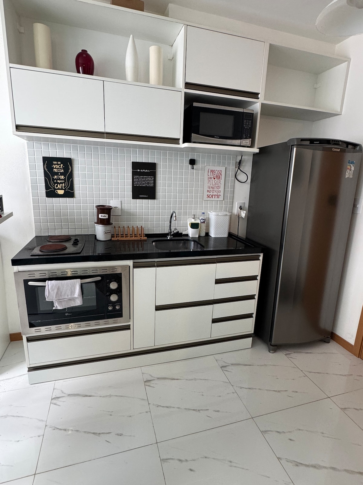 Lindo apartamento, á menos de 50 metros da Praia com acabamento em alto padrão e portaria com segurança 24h. contém ar-condicionado de 18.000 mil Btus para uma perfeita climatização, persianas rolo 100% blackout , geladeira, microondas, cafeteira, sanduicheira, , talheres, pratos, copos, taças de vinho, mesa para refeição com 2 cadeiras, guarda roupa com cabide, toalha e roupa de cama, secador de cabelo, televisão smart.