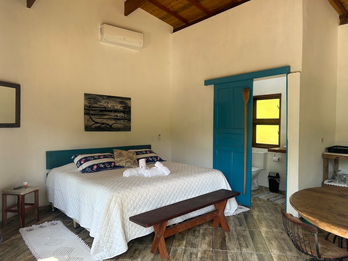 Apto na casa principal do sítio, com ampla varanda e vista para o rio, cachoeira e tobogã da propriedade. Dormitório com teto panorâmico (abertura elétrica) sobre a cama king-size, perfeito para observar as estrelas. Banheiro com banheira e vista deslumbrante. Ar-condicionado quente/frio, ventilador, Smart TV 65” 4K com Netflix, Wi-Fi rápido. Cozinha equipada (geladeira, cooktop, forno elétrico e micro-ondas), sofá retrátil e reclinável, espreguiçadeiras e rede.