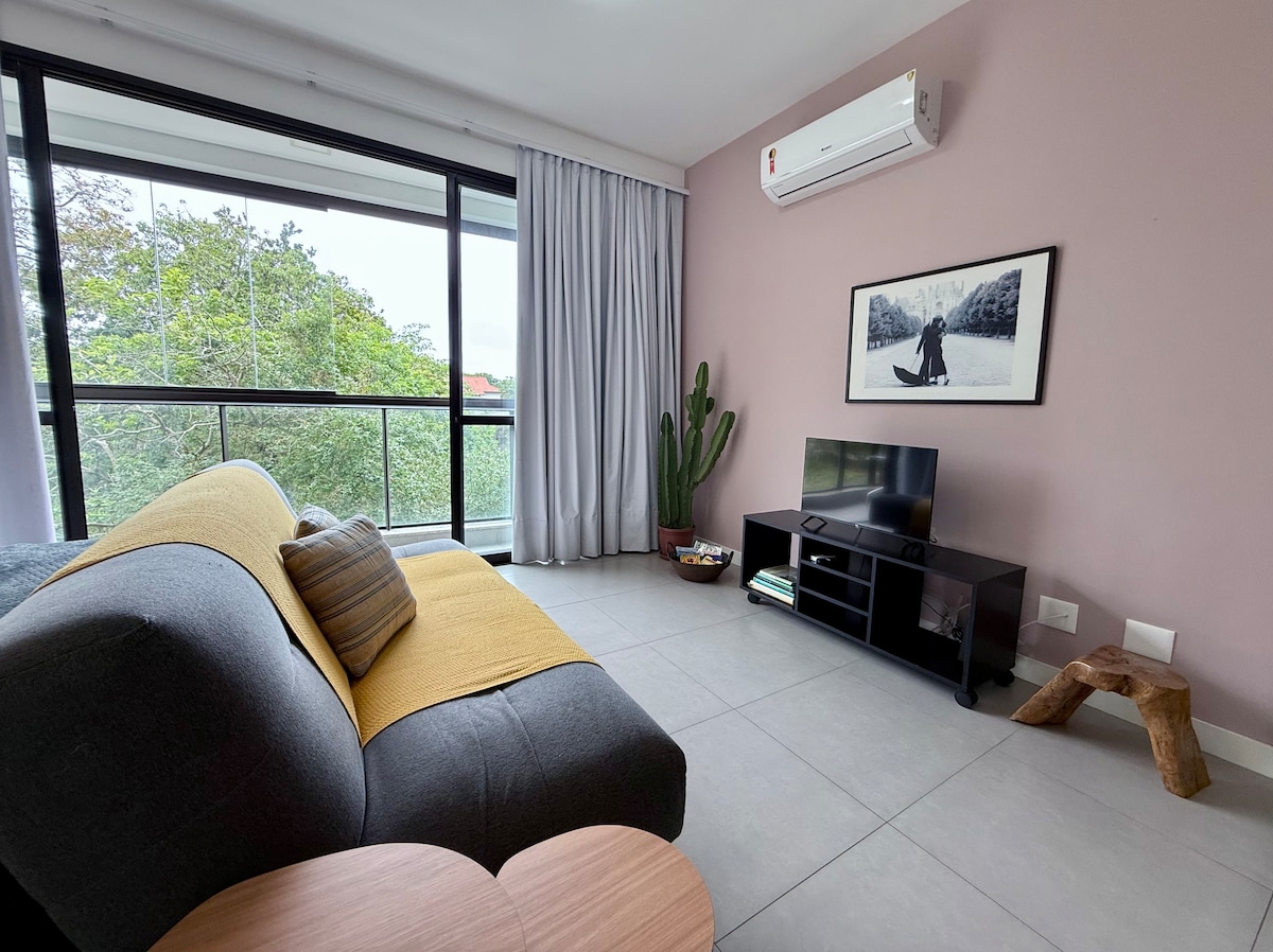 Monolocale nuovo, pulito e confortevole, con aria condizionata e a soli 30 metri dalla spiaggia. Si trova tra le spiagge di Campeche e Morro das Pedras. Il monolocale dispone di una Smart TV da 32 pollici, connessione Wi-Fi da 200 Mb, una cucina completa con frigorifero, congelatore, piano cottura, forno a gas, forno a microonde, forno elettrico e macchina per il caffè. Il soggiorno è integrato e il comodissimo divano letto può ospitare un terzo ospite. La spiaggia è tranquilla, ideale per il surf, le immersioni, il kitesurf o semplicemente per rilassarsi in riva al mare.