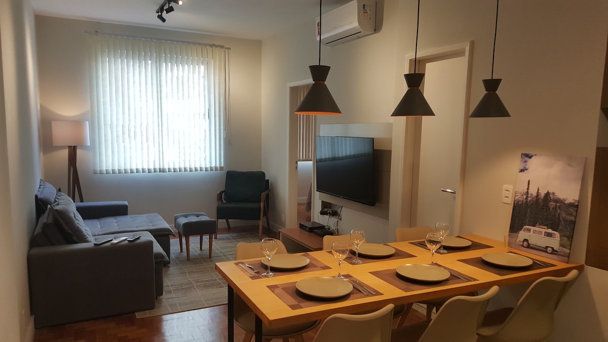Appartamento per 4 persone nel meglio di Ipanema, vicino al posto 10 e a 2 isolati dalla spiaggia. Vicino a ristoranti, supermercati, metropolitana e centro commerciale. Accogliente, confortevole, elegante e con mobili di design. Composto da soggiorno con balcone (con divano letto per due persone), camera suite con letto matrimoniale e bagno principale, cucina, zona pulizia con bagno di servizio e stendibiancheria per i costumi da bagno. Aria condizionata split (soggiorno e camera da letto) e ottima connessione internet (fibra) per il telelavoro.