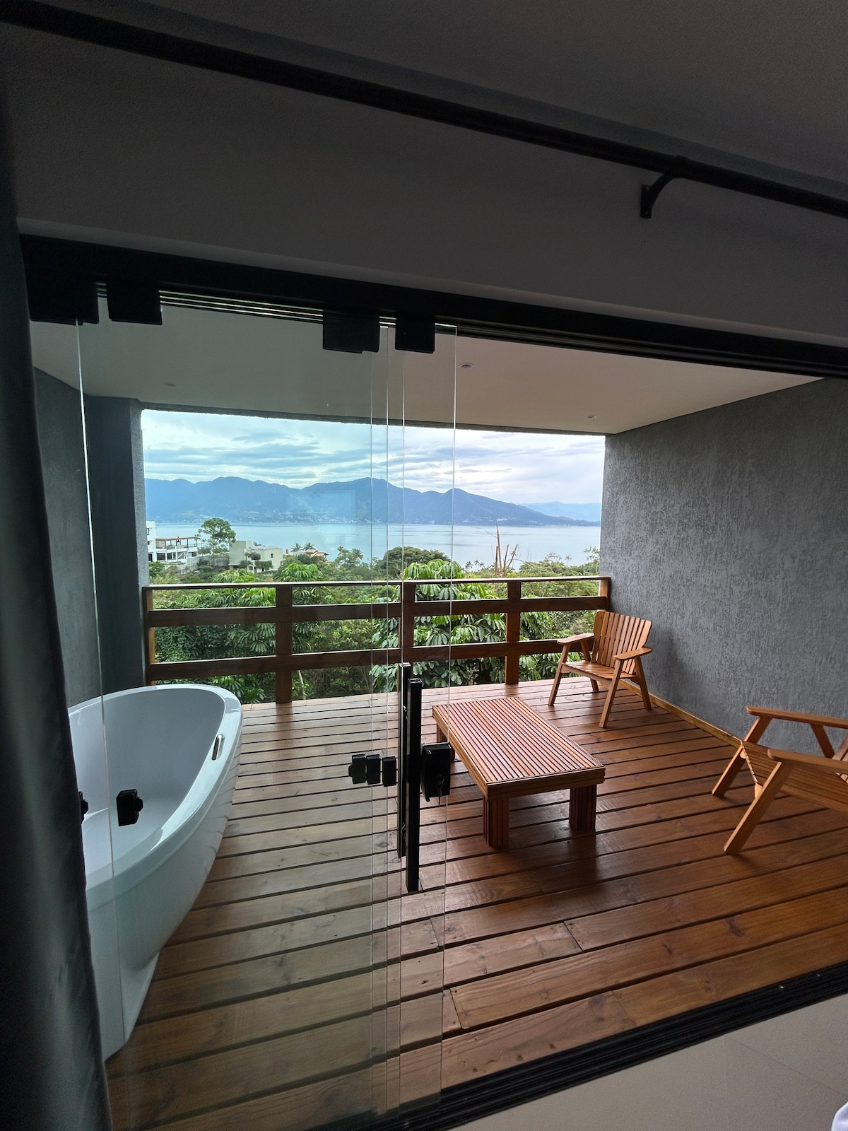 A suíte Master é com varanda e vista para o mar. Banheira com Hidro.