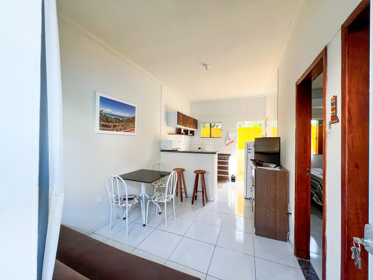 Accogliente appartamento completo per 2/3 ospiti, in un condominio chiuso bello e tranquillo, molto ben situato nel centro di Arraial d'Ajuda molto vicino a vari tipi di negozi e alla affascinante Rua do Mucugê (5 minuti a piedi), ed è possibile lasciare l'auto nel parcheggio e andare a piedi sia di giorno che di notte!!! Il condominio è costruito su una superficie irregolare, quindi ha una scala lungo il percorso che conduce all'appartamento (non consigliato per gli anziani). Insta @VilaZion