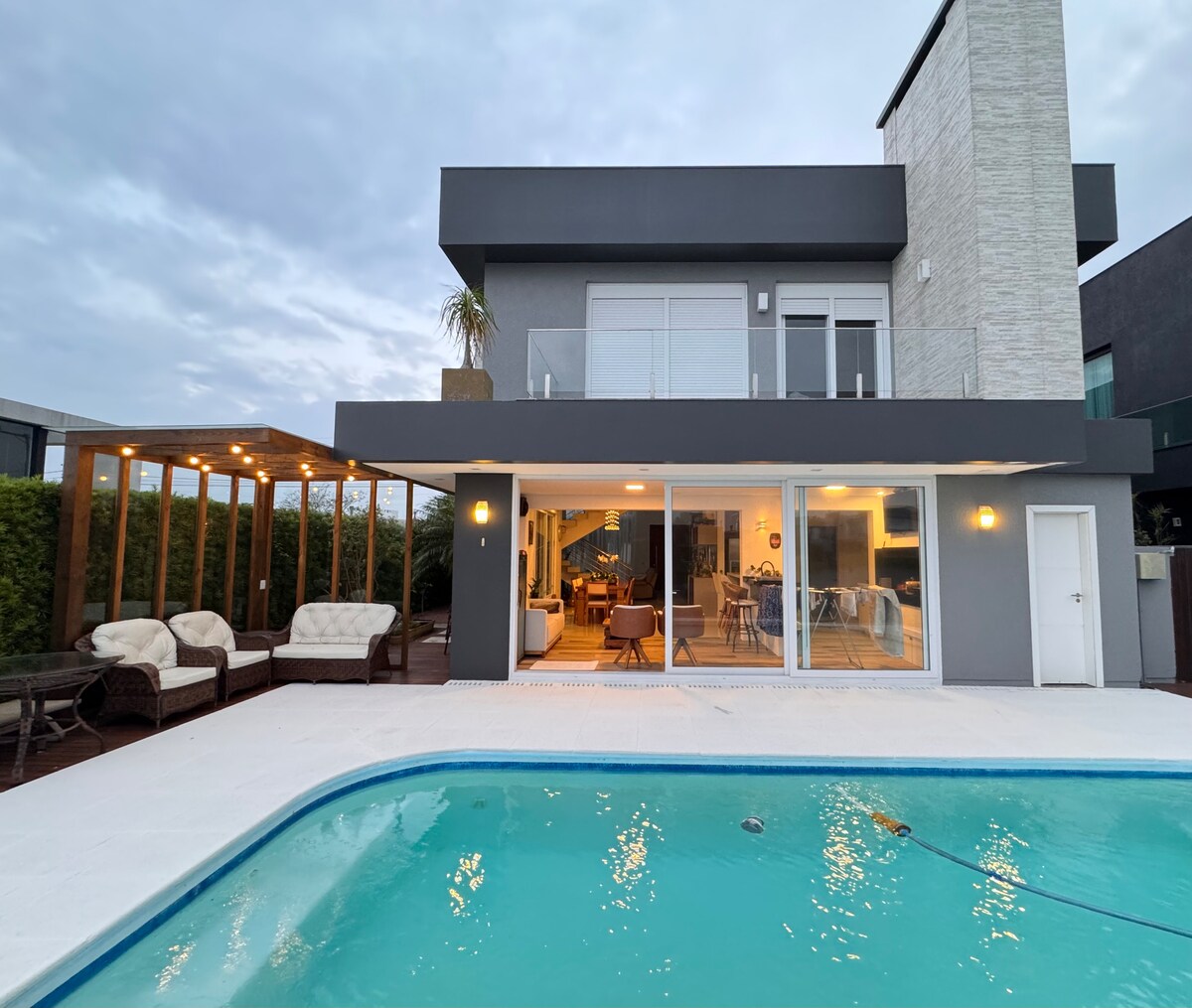Eccezionale casa con 1000m2 con piscina semi-olimpica di sale, vista sul mare e un campo da tennis, campo da calcio, tavoli da barbecue a bordo piscina per 16 persone, con 2 barbecue, sicurezza monitorata 24 ore, 4 suite e due camere matrimoniali, 6 condizionatori in tutte le camere, 2 frigoriferi, 3 televisori di cui uno da 65 ", Wi-Fi 100mb, sala giochi con tavolo da biliardo professionale, 3 salotti e sala per feste per 30 persone. Servizio di pulizia opzionale.