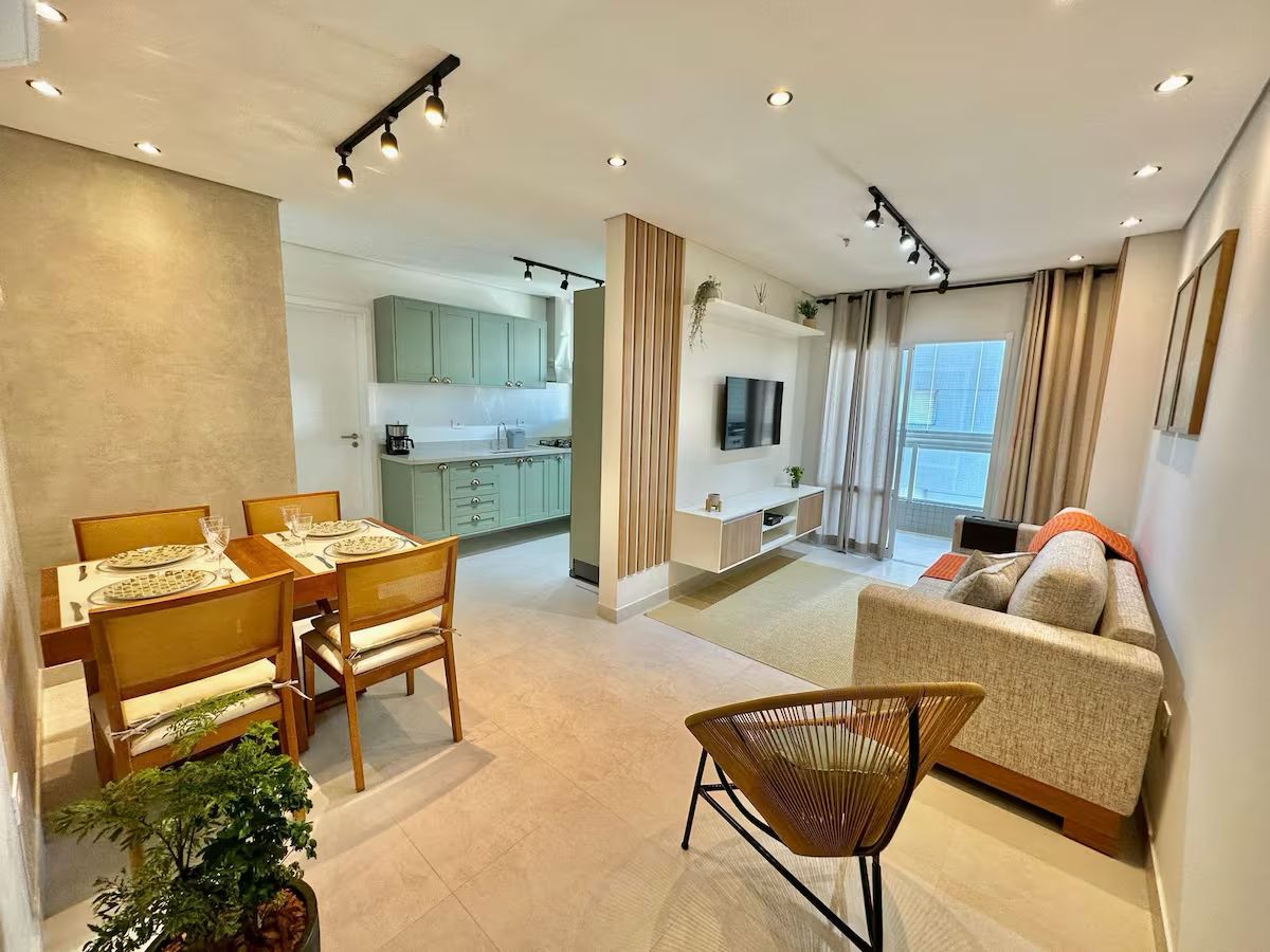 Apartamento 1 dormitorio a 2 quadras da praia, estacionamento privativo, um dos melhores bairro da região. Próximo a supermercados, restaurantes, farmácias, bares. e ao centro comercial do boqueirão. Quarto com duas camas de solterio e um sofá cama na sala; internet fibra otica e tv com todos os canais desbloqueados. cozinha completa. Janelas com tela de proteção, colher e jogos de cartas.