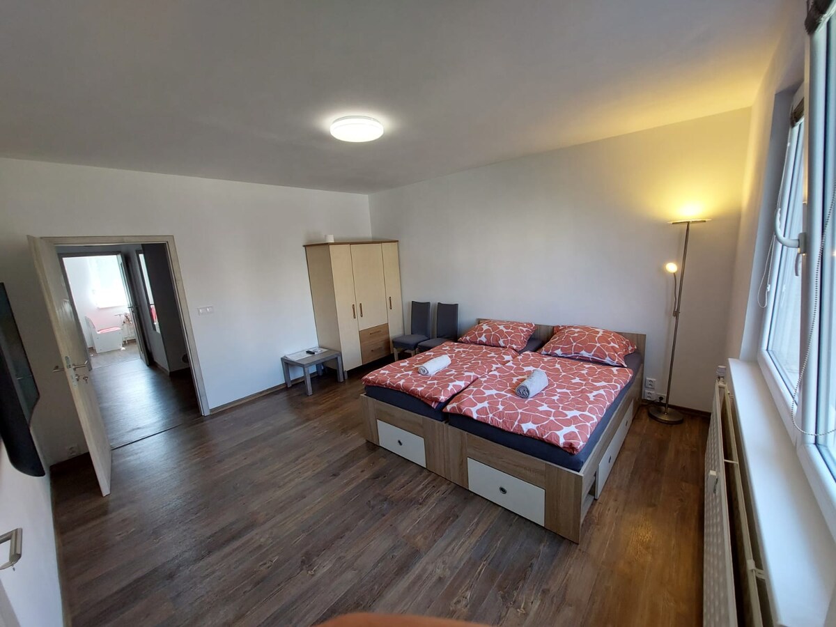 Benvenuti nel nostro appartamento pratico e spazioso, adatto a famiglie o gruppi di massimo 7 persone. L'alloggio è composto da 3 camere con serratura, ideali per chi cerca una combinazione di privacy e prezzo accessibile. L'appartamento dispone di: 1 camera grande (15 m²) con letto matrimoniale e divano letto, 2 camere separate (25 m² in totale), ognuna con letto matrimoniale, Lenzuola, asciugamani e Wi-Fi sono ovvi. Il check-in avviene separatamente tramite una cassaforte per le chiavi o previo accordo.
