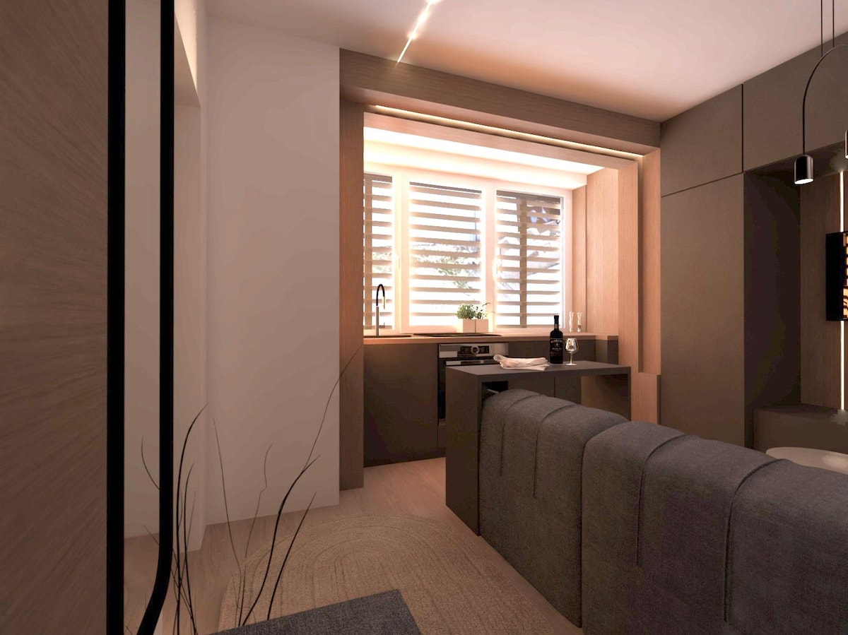 L'appartamento è realizzato in stile classico ed è composto da due stanze - una camera da letto e un soggiorno, per una superficie totale di 36 m ² - e un'ampia terrazza solarium di 15 m ². Dall'ingresso c'è una porta che conduce al bagno con ampia doccia e servizi igienici. Dopodiché si entra nel soggiorno con cucina, zona pranzo e un grande divano letto dove due persone possono dormire. La cucina è dotata di frigo congelatore, piano cottura in ceramica, forno a microonde, bollitore e tutto il necessario per cucinare.