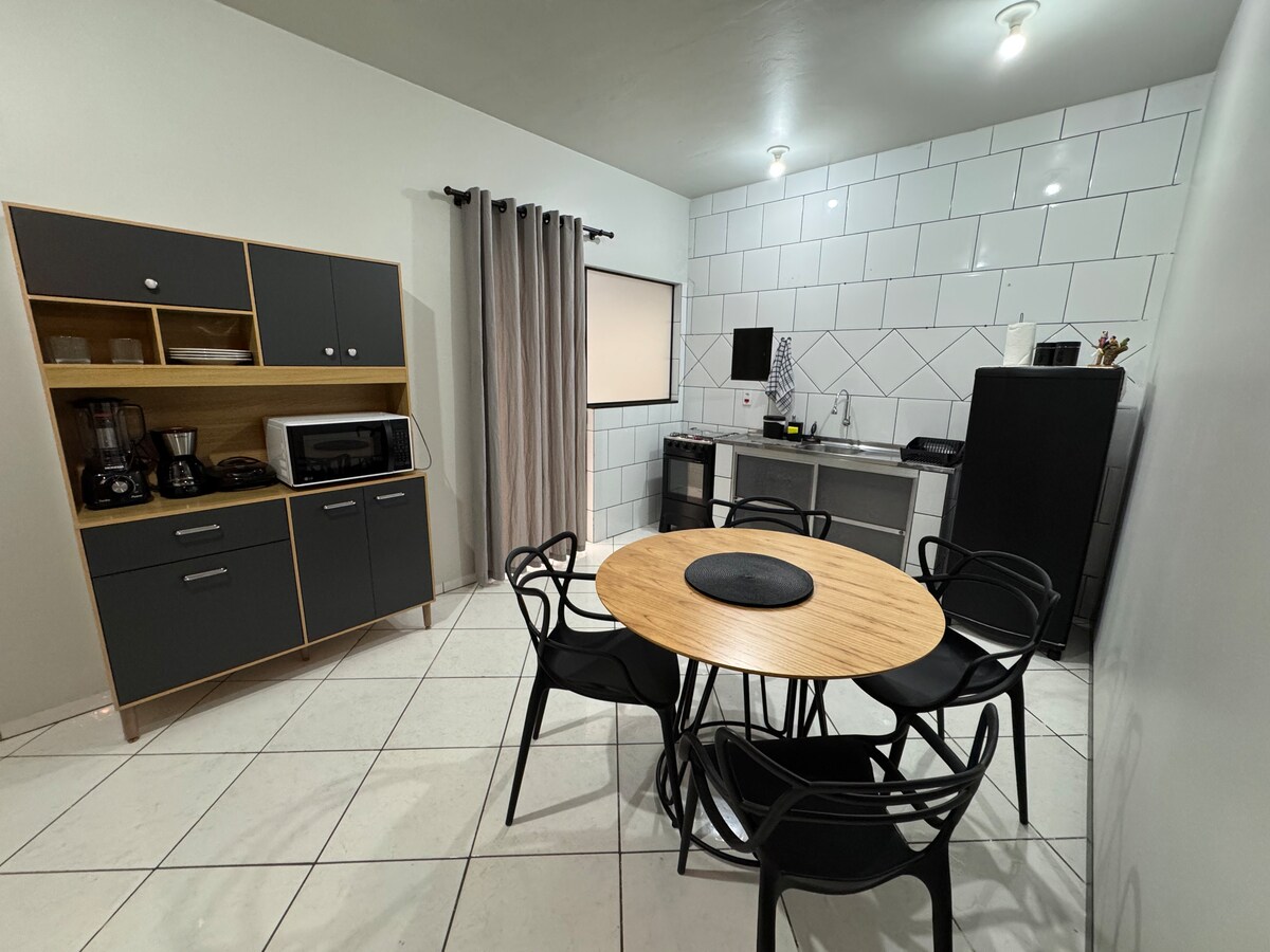 Bem-vindos à nossa casa de dois quartos ar condicionado! com uma cama de casal e três camas de solteiro, perfeita para famílias ou grupos de amigos que buscam conforto e praticidade. A cozinha é equipada com necessário para preparo de suas refeições, além de uma sala de estar e sala para refeições para momentos de convivência. A garagem espaçosa acomoda dois carros e a lavanderia está disponível para uso. A localidade é tranquila, a menos de 3 minutos do Centro. Reserve agora e sinta-se em casa!