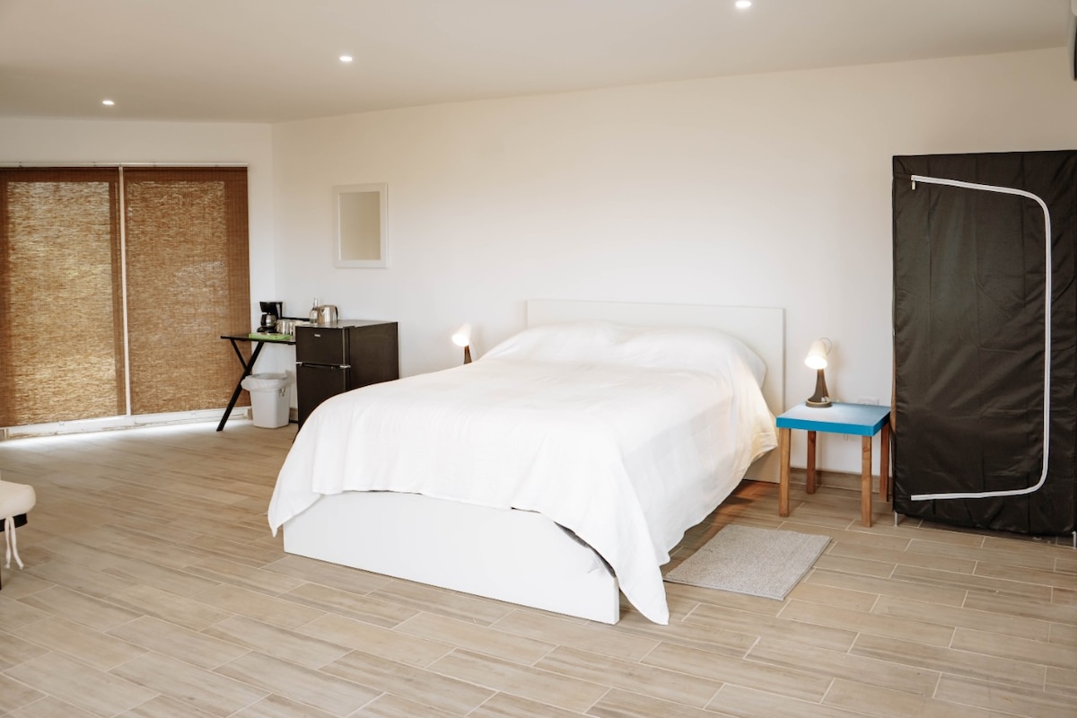 FREE Parking al aire libre en la esquina con espacio para 4 coches. Nosotros ofrecemos 4 estacionamientos compartidos para todos los huéspedes con espacios limitados. (Preguntanos por disponibilidad de espacios) 2 huespedes departamento en Rosarito! Es un loft para 2 huéspedes, ubicado a menos de 2 millas de distancia del Rosarito Beach Hotel/Papas & Beet. (8 minutos manejando). Vas a encontrar: - 1 recamara cama Queen. - 1 baño completo. - Cocineta completamente equipada.