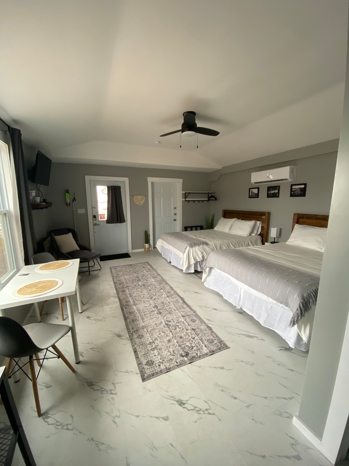 Stay in the centre of the action in this one-of-a-kind place. 1 Bedroom / 2 Full beds / 1 King bed / 1 Bathroom/kitchenette This room is equipped with Wifi, AC, Refrigerator, BBQ, Microwave, coffee machine, TV, Bath, Pet-friendly, Non-smoking Daily housekeeping is available upon request. The back door leads to a private deck area with a BBQ grill.