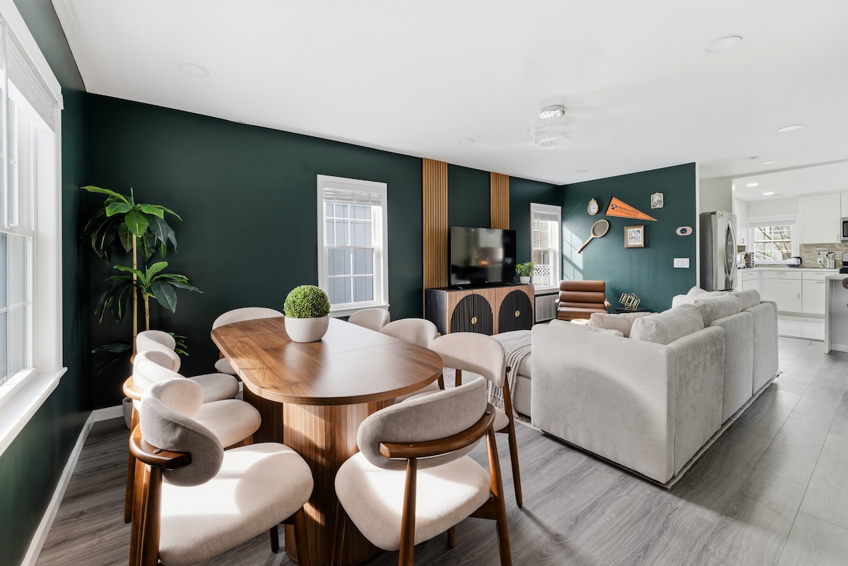 Duplex coloniale moderno a pochi isolati dalla Princeton University: • A pochi passi da decine di ristoranti, parchi e negozi • Biciclette • Postazione di ricarica per veicoli elettrici + 2 posti auto • Palestra: cyclette, pesi, kettlebell, step • Adatto alle famiglie: lettino da viaggio, seggiolone, giochi, ombrelloni • Smart lock Yale + Wi-Fi veloce • Cucina con macchina per caffè espresso, caffettiera a stantuffo, macchina per caffè americano e caffè freddo Perfetto per famiglie, docenti, riunioni e weekend.
