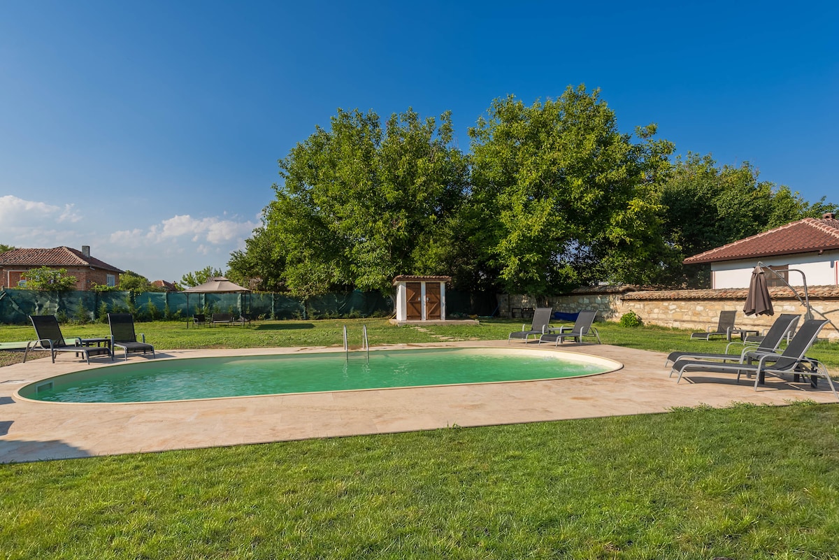 La nostra villa unica si trova a East Stara planina, in Bulgaria. È un luogo tranquillo adatto a famiglie e gruppi di amici. La nostra pensione può offrirti 5 camere da letto con capienza massima di 14 persone, 2 bagni, cucina completamente attrezzata, atmosfera accogliente, ampio giardino e vista mozzafiato. All'esterno della casa troverai parcheggio, posti a sedere all'aperto, barbecue, vista mozzafiato e il nostro più grande orgoglio: il laghetto balneabile bio-infinity.
