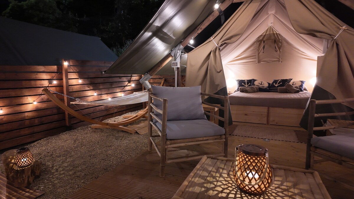 Tenda per 4-5 persone immersa nella natura. Esperienza autentica e rilassante a pochi minuti dal mare. 1 letto matrimoniale, 1 letto a castello con terzo letto estraibile, frigo. All'esterno una cucina privata con due fuochi ad induzione (no lavandino, disponibile nelle aree comuni) e uno spazio coperto per mangiare all'aria aperta. Bagno, lavandini e docce (1€) comuni. Zona barbecue condivisa. Area relax privata con lettini prendisole. Piscina inclusa.