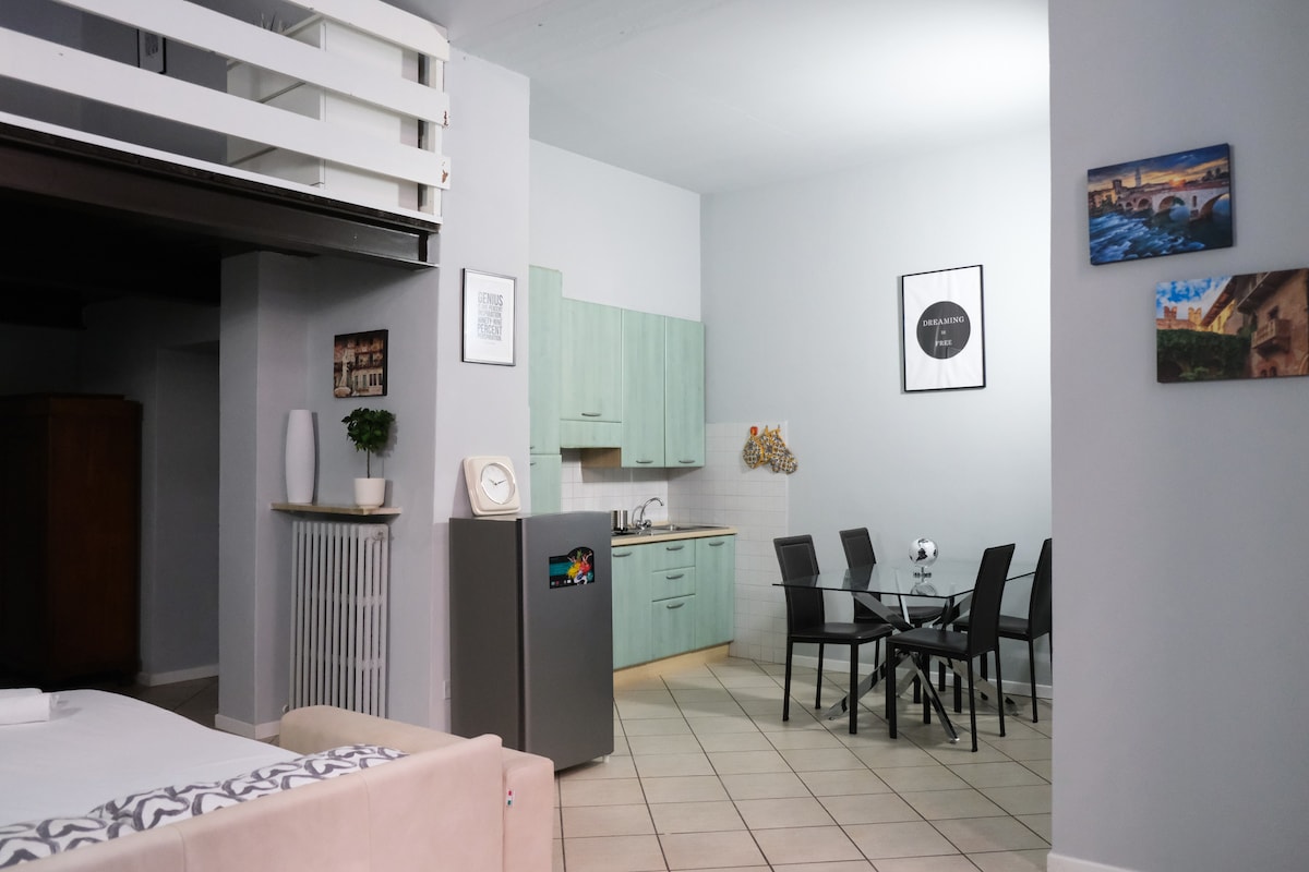 Luminoso loft di recente ristrutturazione completo di cucina e zona letto attrezzate , bagno e zona soggiorno con divano letto , pavimenti in resina .Adatto per trascorrere una vacanza romantica nella meravigliosa Verona A disposizione culla per piccoli ospiti . Riscaldamento e condizionamento autonomi. Dopo una giornata passata a visitare le innumerevoli meraviglie che la città dell'amore vi offre, troverete nel mio loft uno spazio tranquillo e accogliente dove rilassarvi Amo la mia città!