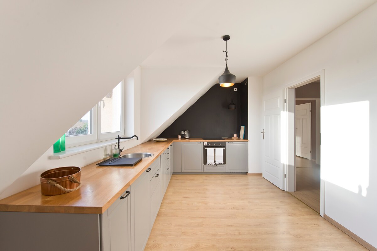 Il nostro incantevole appartamento (con aria condizionata) si trova in una tranquilla zona di case unifamiliari, a breve distanza dal centro storico di Danzica (30 minuti a piedi) La mansarda di recente costruzione che mettiamo a vostra disposizione è stata progettata in modo funzionale e completamente attrezzata. I suoi interni sono arricchiti da grafiche di giovani artisti, antiche incisioni della città e fiori. 9,6 km - 25 minuti in auto - Spiaggia Fermate di tram e autobus - 8-10 minuti a piedi dall'appartamento Vi invitiamo :)