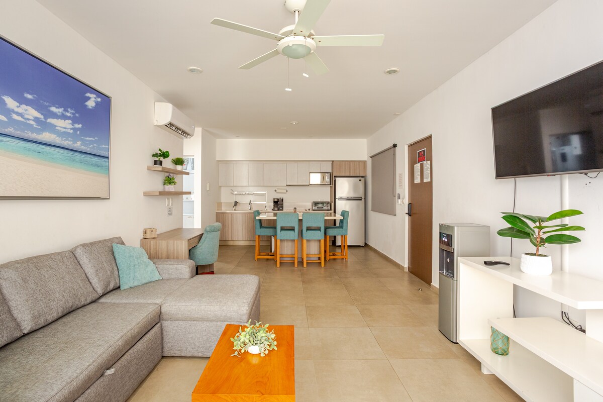 Fall in love with Puerto Morelos ♥️ Great option on the beach side of Puerto Morelos or to be close to the airport on the first or last leg of your trip. In the heart of the Riviera Maya, 15-min south of the Cancun International Airport, on the south side of the charming town of Puerto Morelos, modern one-bedroom condo with great amenities. Amazing location, to enjoy all Puerto Morelos has to offer. Close to the beach, restaurants, cafés, supermarket and town square.
