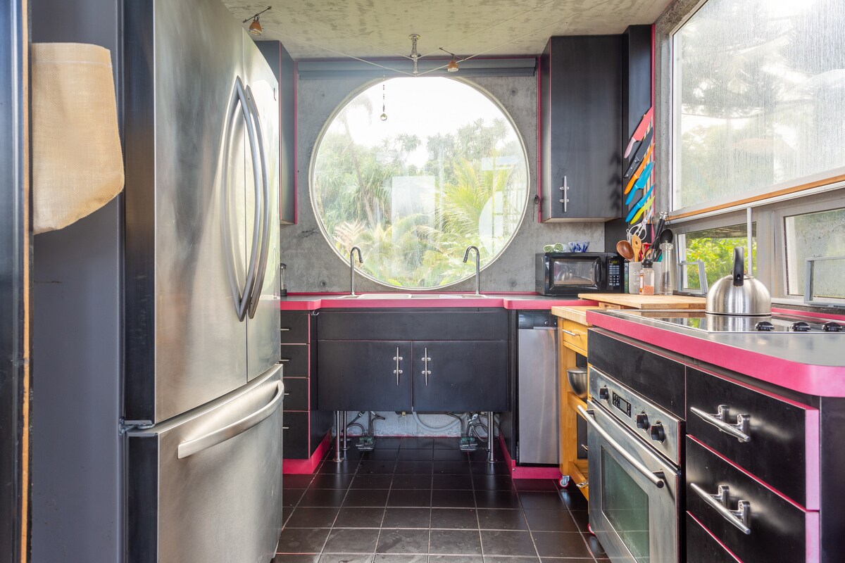 Questa casa è ovviamente unica ed è stata persino presentata su HGTV's Off Beat American & The Travel Channel, ma è il terreno stesso di cui ci siamo innamorati. Questa casa interamente in cemento si affaccia sull'oceano ed è arroccata su una scogliera lavica a Kehena Point. Il punto si protende nell'oceano oltre le scogliere laviche circostanti e offre una vista impareggiabile sulla costa in entrambe le direzioni. Osserva le balene in stagione (da novembre ad aprile) e raggiungi a piedi una spiaggia di sabbia nera.