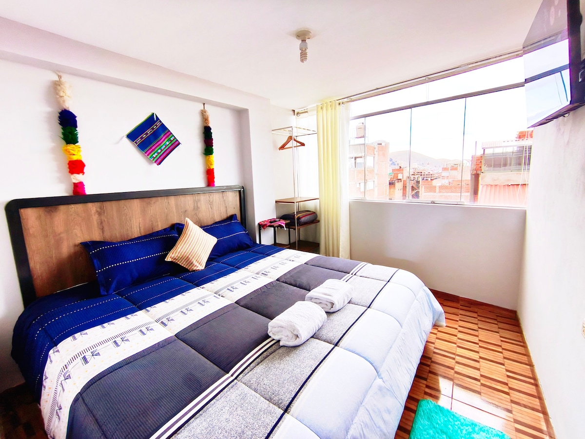 La vista ti stupirà e godrà di un ambiente privato e luminoso! ❇️ Salotto con smart TV ❇️ Postazione per il tè con bollitore, thermos, microonde e stoviglie. ❇️ 1 letto matrimoniale Doccia ❇️ separata e privata. Bagno ❇️ indipendente e privato. Garage ❇️ privato (a pagamento) La zona è sicura e puoi visitare un mercato tradizionale, vieni a immergerti nella cultura di Puno!