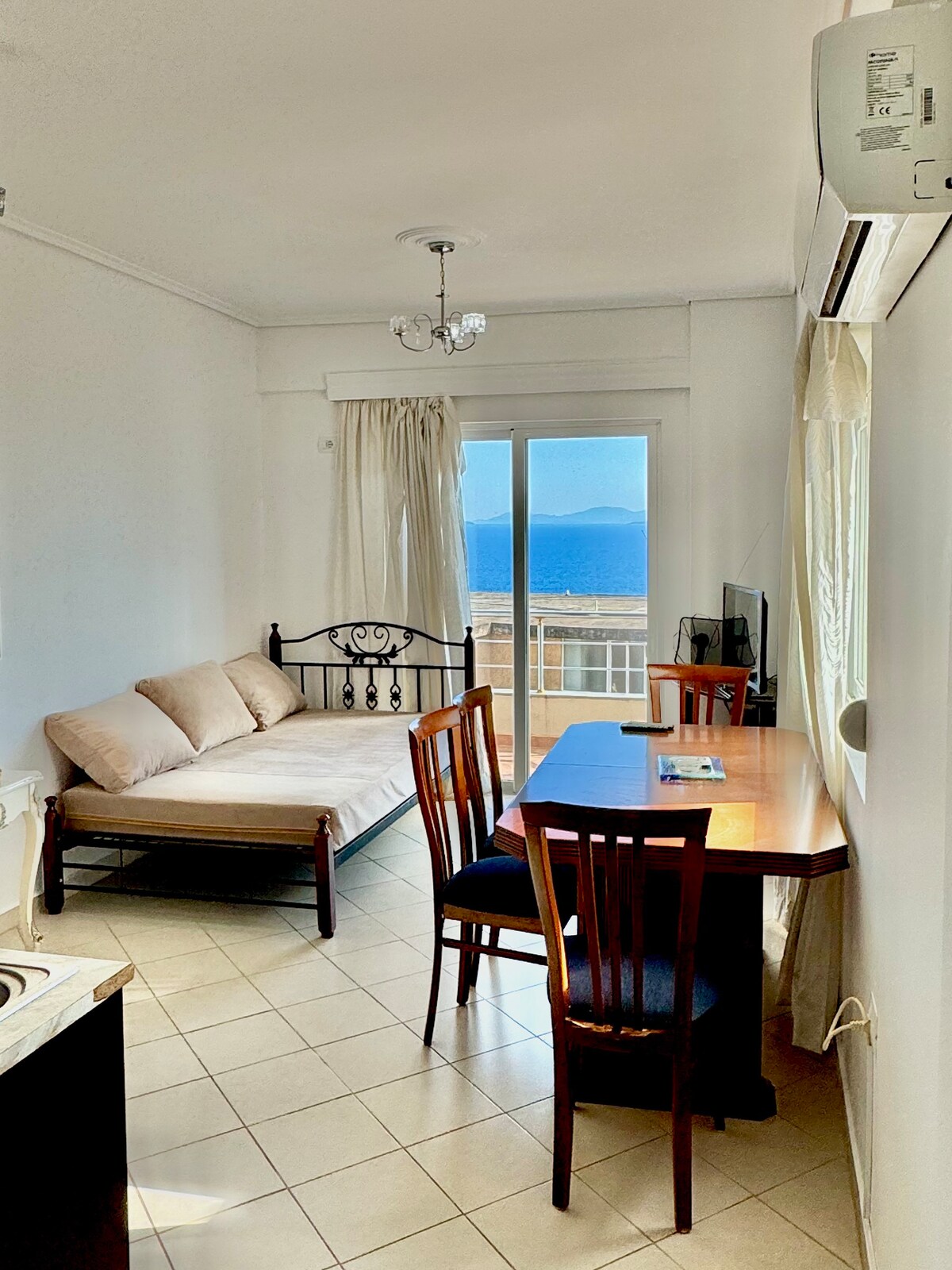 La casa si trova sulla prima linea della strada, con vista sul mare, al quarto piano. L'appartamento è completamente arredato. La cucina e il soggiorno sono nella stessa stanza e dispongono di un solo condizionatore. Sono inclusi anche lenzuola e asciugamani.