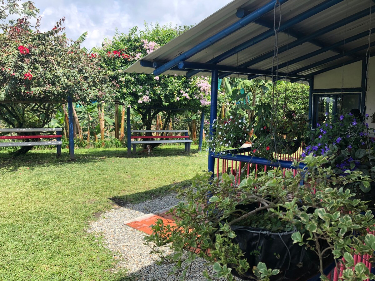 Soggiorna a Casa Laureles, una tradizionale piantagione di caffè con sistemazioni accoglienti. Questa cabina privata dispone di un letto matrimoniale, bagno con acqua calda, cucina, TV, Wi-Fi e splendide viste sulla campagna che renderanno il vostro soggiorno indimenticabile. Partecipa al nostro tour del caffè: passeggia tra i campi, scopri il processo di lavorazione e degusta il caffè appena preparato, godendoti la natura e la tranquillità. Puoi anche esplorare i nostri paesaggi, giardini e sentieri ecologici, il tutto accompagnato da un servizio caloroso e personalizzato.