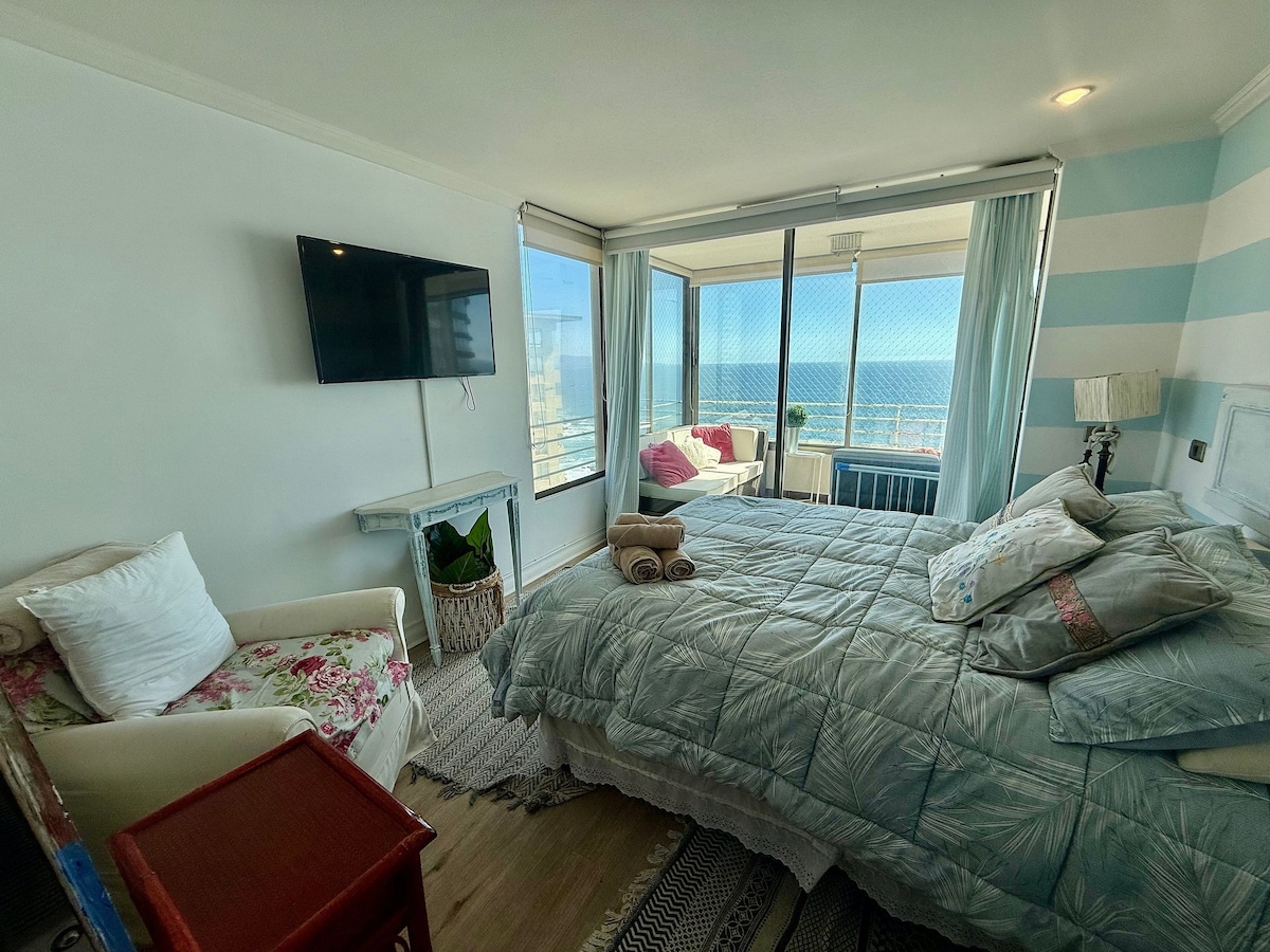Appartamento al 11° piano, vista mare, Hotel Enjoy e casinò, Internet ad alta velocità, nel cuore di Viña, a pochi passi da Avenida Perú e San Martín. Zona di ristoranti e negozi. Comoda terrazza con una vista eccellente. Completamente attrezzato e finemente arredato. Soggiorno con cucina integrata e divano letto. Camera in suite con letto matrimoniale. Edificio con piscina riscaldata e palestra. Parcheggio sotterraneo privato dell'appartamento. Capacità 2 adulti o un adulto e un minore.