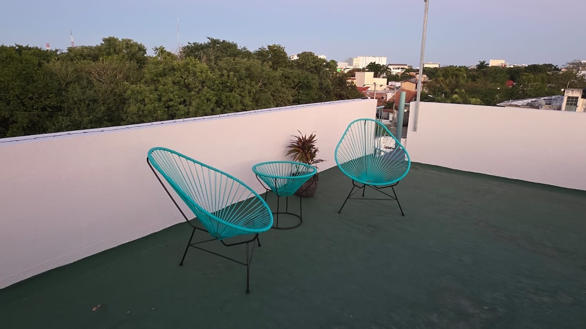 Splendido loft a soli 3 isolati dalla spiaggia di Playacar. A 2 isolati dalla famosa Quinta Avenida con tutti i tipi di servizi, shopping, mangiare, bere una tazza di caffè o un drink. Luoghi danzanti e tutto il divertimento di Playa del Carmen. Si trova molto vicino al traghetto ⛴ che porta a Cozumel. È perfetto per una coppia o una famiglia di 3 persone.