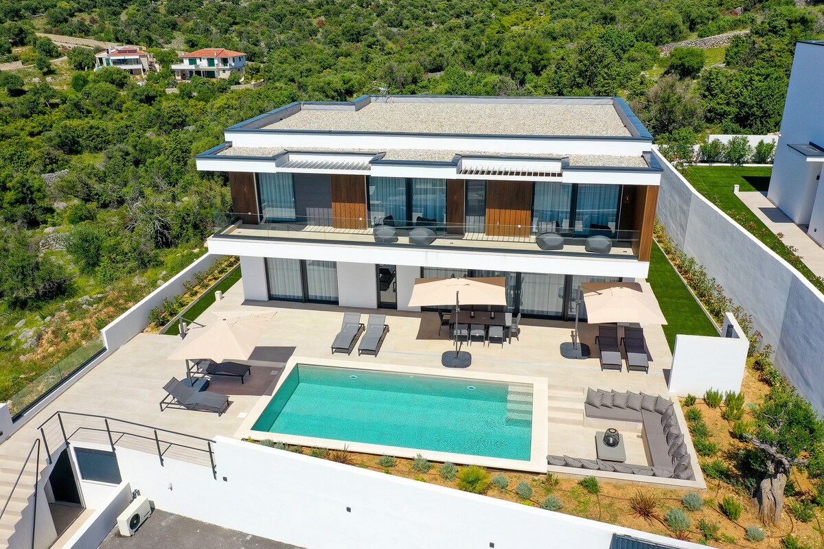 NOVITÀ per la stagione 2025!!! Mini-piscina idromassaggio privata e sauna a secco (finlandese) sulla magnifica terrazza panoramica con vista sul mare. Sistema di cromoterapia sia nella mini-piscina che nella sauna. Goditi il sole e i tramonti in una spa all'aperto con una magnifica vista sul mare Adriatico e sull'isola di Krk! Perfetto per 6-7 persone. Ci sono 3 camere da letto, ciascuna con un letto matrimoniale + 1 letto singolo Aria condizionata. Barbecue disponibile in giardino, wifi ad alta velocità, parcheggio.
