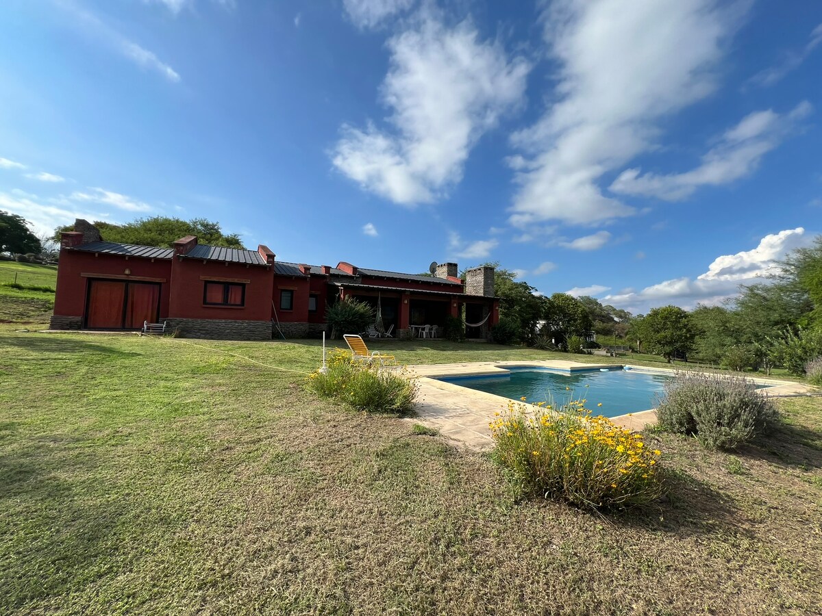 Casa de campo acogedora en barrio cerrado con seguridad 24 hs. Vista espectacular a la montaña, piscina con solarium, amplio parque, hogar a leña, cocina equipada, parrilla, juegos, blanquería y vajilla. Ideal para parejas y familias que aman la naturaleza. Restaurant y estación de servicio cercanos.