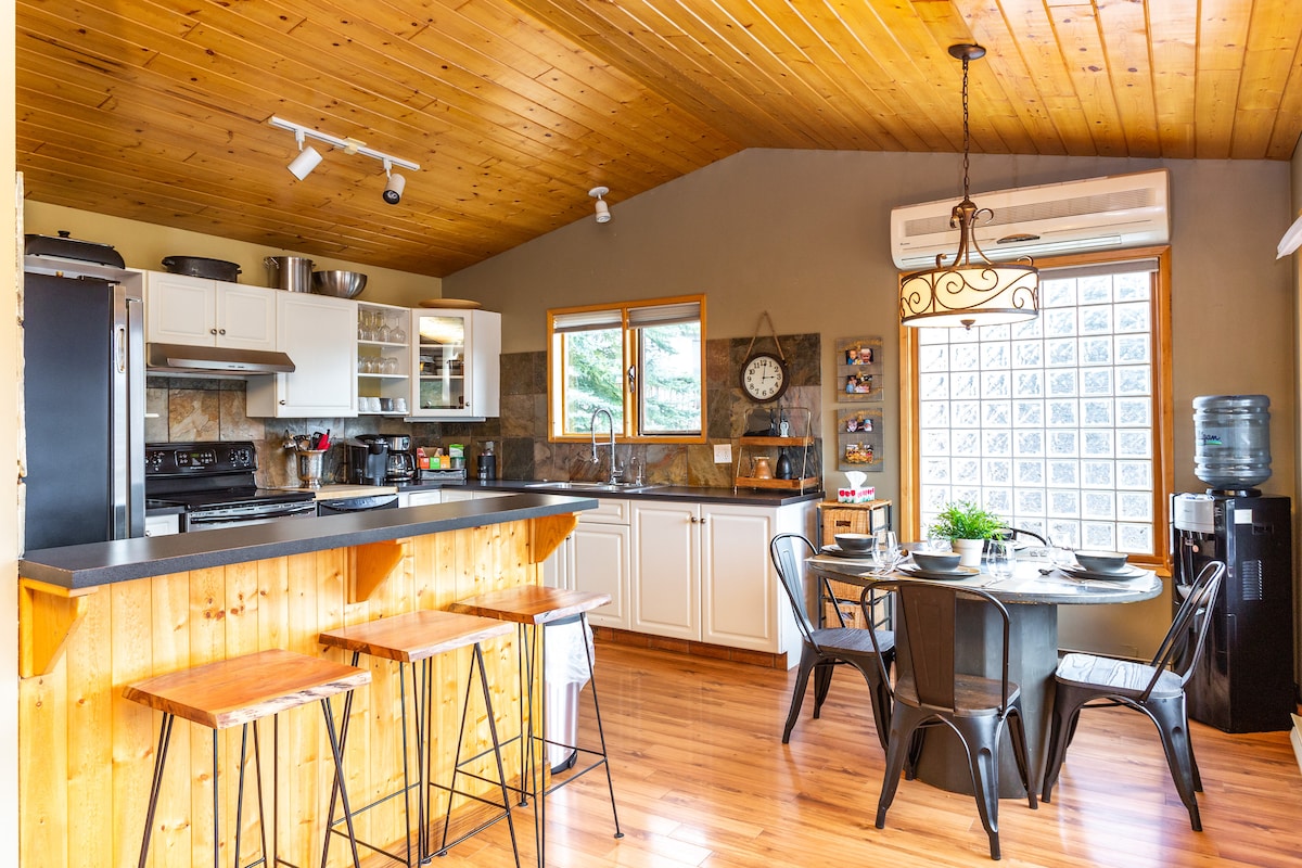 Immerso tra gli alberi in cima a una collina, si trova il nostro amato chalet con tetto spiovente. Entra e goditi la vista mozzafiato sulle Montagne Rocciose dalle ampie vetrate che circondano il soggiorno open space. Decorato con piante e vari oggetti che abbiamo scoperto durante il viaggio, questo spazio è un vero e proprio lavoro d'amore. Siediti sotto le stelle (evviva, nessun inquinamento luminoso!) nella gloriosa vasca idromassaggio per 8 persone... Arrostisci marshmallow intorno al fuoco... Griglia un banchetto sul barbecue aperto tutto l'anno.