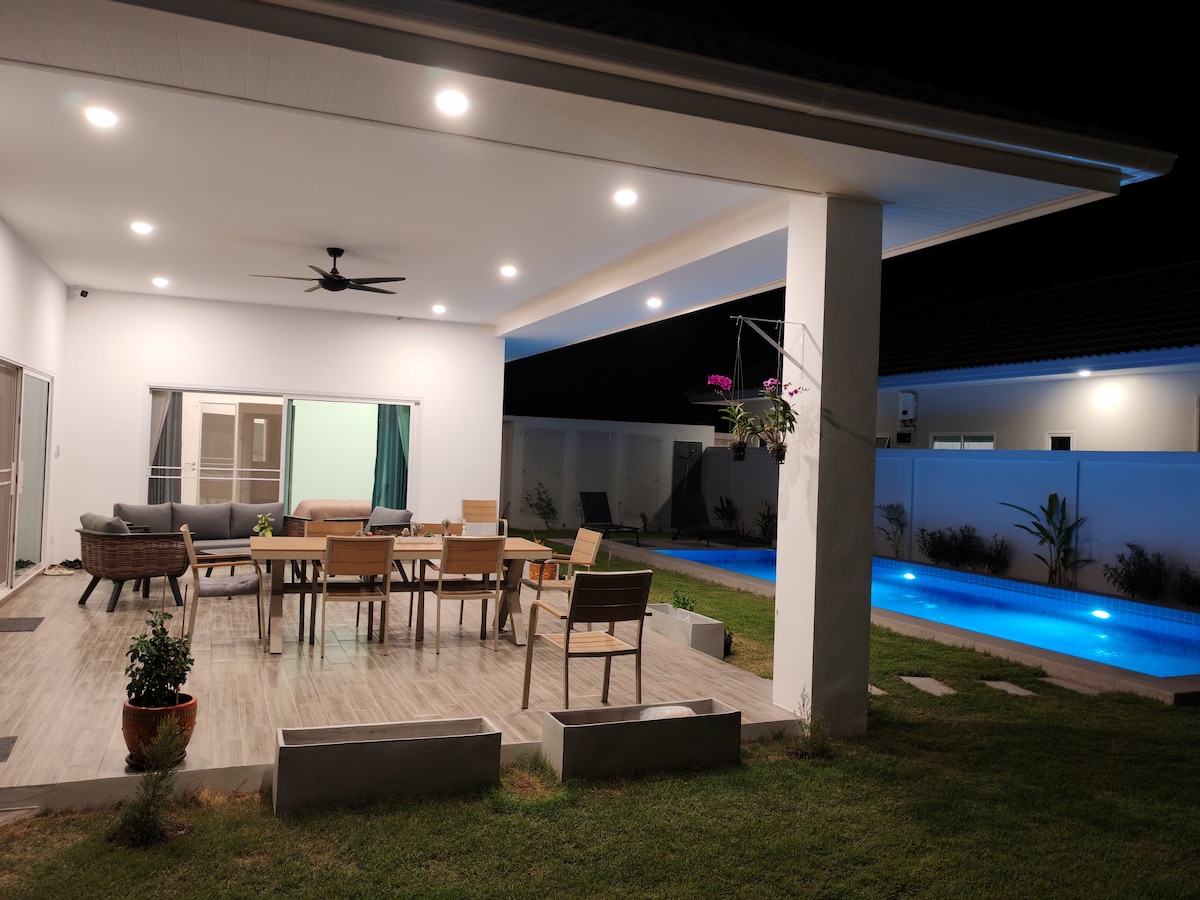 Fuggi dalla città e rilassati in questa tranquilla villa con piscina e 3 camere da letto a pochi minuti dalla spiaggia di Pranburi. L'Areeya Retreat offre una piscina privata, un tavolo da biliardo, una cucina completamente attrezzata e un luminoso spazio abitativo con luce naturale, perfetto per rilassarsi o lavorare da remoto con la connessione Wi-Fi veloce. Circondato da campi e a soli 1,3 km dalla strada della spiaggia, è ideale per famiglie, gruppi o coppie in cerca di comfort e tranquillità. Approfitta di sconti del 15-30% per soggiorni settimanali e mensili.