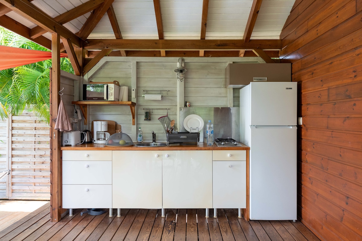 Grazioso bungalow in legno, classificato 3 stelle (per 2 persone ma può ospitare fino a 4 persone) situato nelle immediate vicinanze del mare e delle sue spiagge. È stato costruito nello spirito "capanna" e si trova in un luogo ben ventilato all'ingresso del nostro giardino. Al risveglio potrete godervi l'alba sulla terrazza. Al momento di coricarvi, sarete inebriati dal profumo di Ylang Ylang e cullati dal canto delle rane.