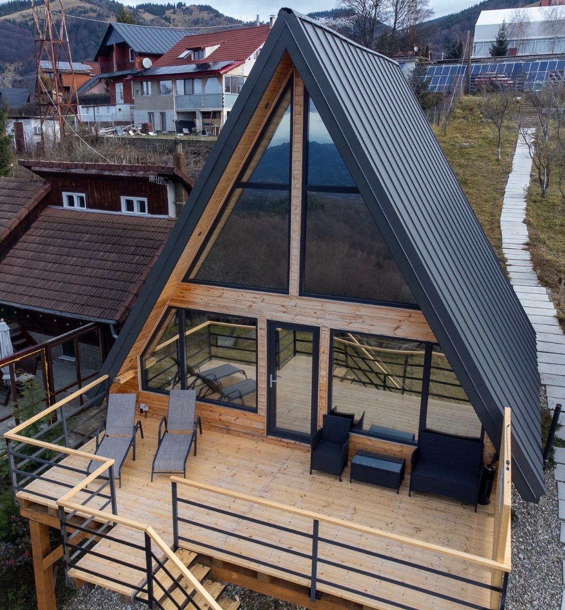 Peak A View Chalet is a cozy A-frame cabin at the foot of the Vâlcan Mountains, in Lupeni. Enjoy stunning views of the Retezat Mountains. Just a 10-minute drive to the Straja chairlift — where mountain views and adventure await. Activities in the area: • Mountain hiking: Straja, Retezat • ATV and mountain bike rental • Winter sports: skiing The exterior of the chalet is not completely finished, but the interior is fully furnished and functional. NO work is being carried out during your stay.