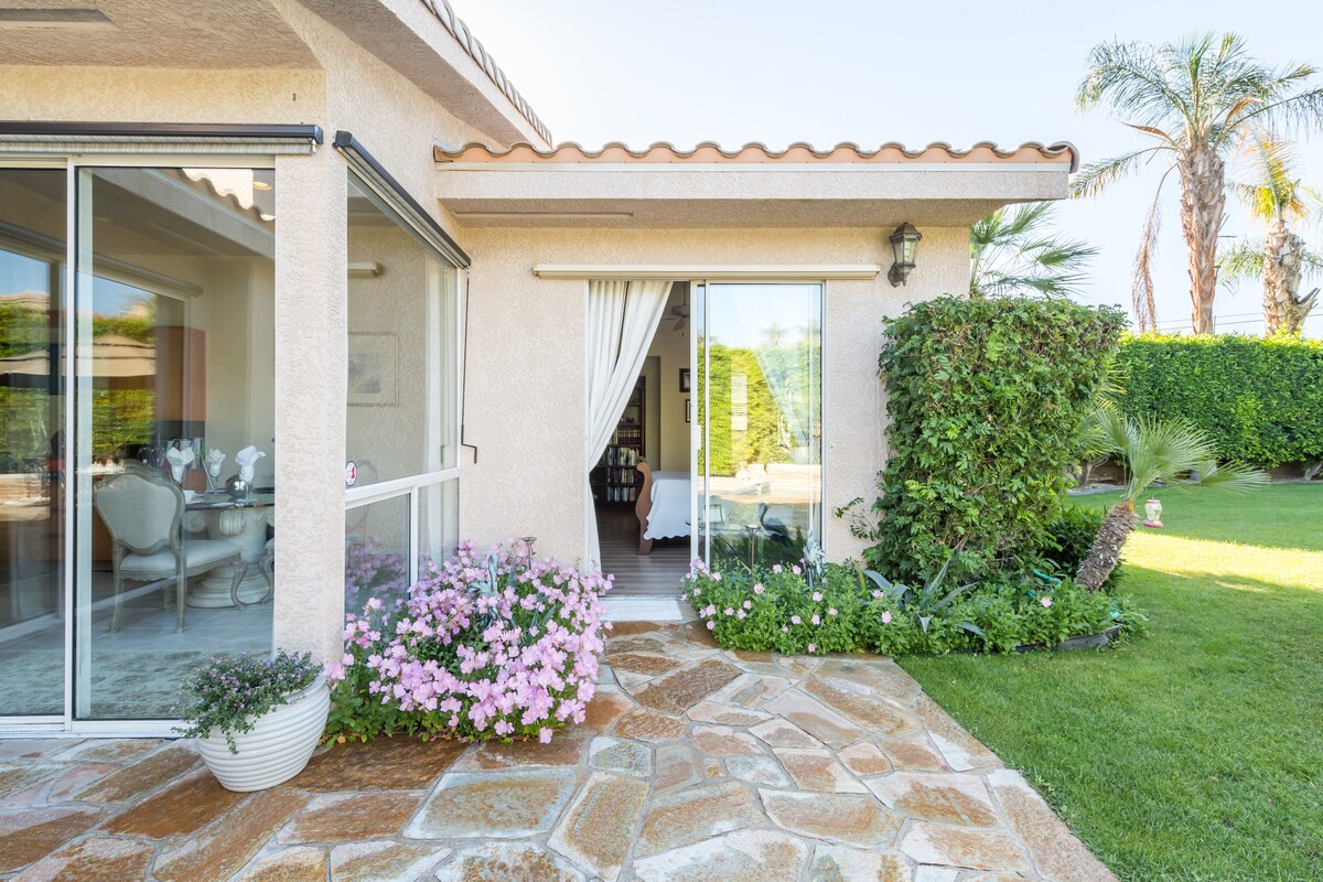 Splendida suite PRIVATA, con ingresso indipendente, bagno privato, splendido prato verde lussureggiante, vista sulle montagne, con vista sulla piscina tecnica di ciottoli, ideale per rilassarsi e divertirsi. Cuore del deserto, a 5 minuti a piedi dai famosi negozi di lusso di El Paseo. A pochi minuti a Indian Wells Tennis Gardens, ristoranti, vicino a Palm Springs . Attrezzature: TV, Micro, Keurig, Frigorifero. * La piscina è aperta e può essere condivisa solo con 2 ospiti aggiuntivi se l'altra suite è prenotata