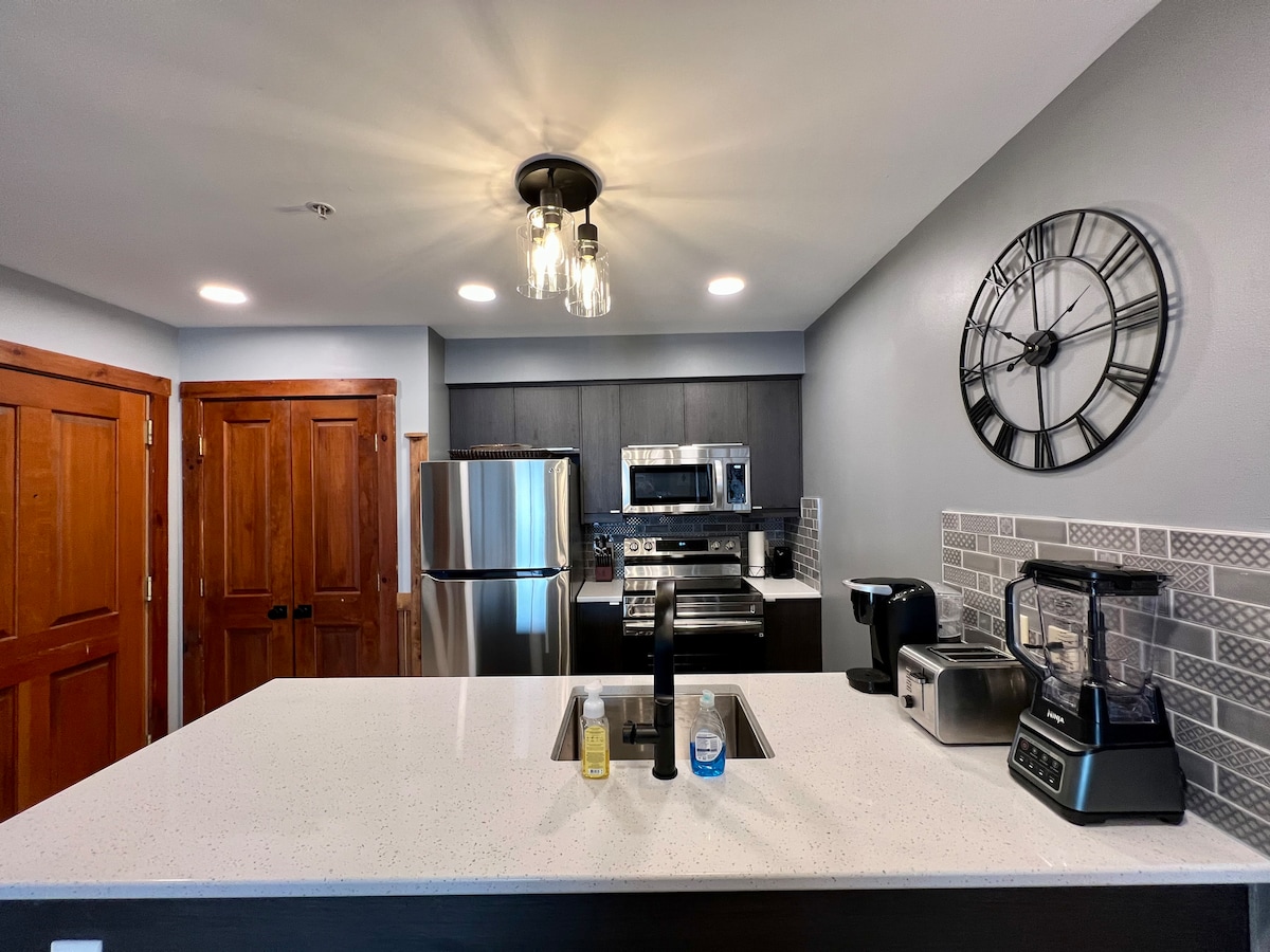 Modern meets old world charm in this newly renovated Highland House condo! Enjoy a fabulously appointed unit with many unique barnwood accents! The kitchen includes a full size refrigerator, dishwasher, microwave, toaster, coffee pot, induction cooktop and a pullout table for two. The king-sized memory foam bed is amazing and at 14 inches off the ground, is the perfect height to store unused luggage.