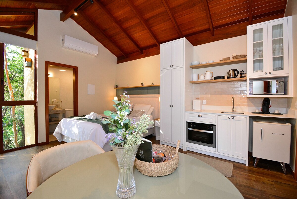 We are the @greenhouseexperience Una vacanza esclusiva in mezzo alla natura, a soli 3 km da Jurerê International. Il nostro chalet, perfetto per le coppie, offre il comfort essenziale per un'esperienza indimenticabile di connessione con la natura. Rilassati sul balcone alberato, goditi la sauna finlandese, la vasca idromassaggio all'aperto e riscaldati accanto al caminetto a legna. La proprietà dispone anche di un'unità residenziale e di un altro cottage, dove uno spazio terapeutico è a disposizione di ospiti e visitatori.