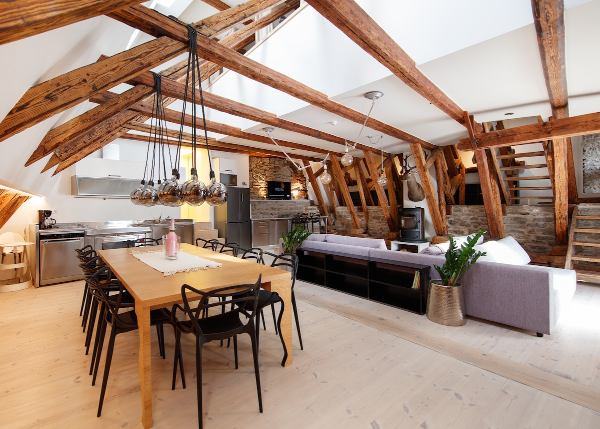 L'attico contemporaneo con magnifiche viste sui tetti e sulle torri è situato in un edificio storico del XIV secolo, nel cuore del centro storico di Tallinn. Puoi goderti facilmente il fascino del centro storico passeggiando per i vicoli fino a numerosi ristoranti, negozi e musei.