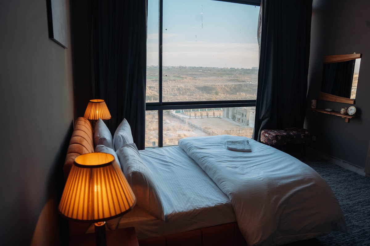 Comfort e cura garantiti. Entra nell'Aventus Luxury Condo, il condominio più elegante, raffinato e bello da vedere di Rawalpindi. Goditi un soggiorno sicuro e confortevole in questo appartamento in posizione centrale. Che tu sia in visita per svago o per lavoro, noi di Aventus ti garantiamo un'esperienza a 5 stelle. Gli ospiti possono inoltre usufruire di parcheggio gratuito, wifi gratuito e di una splendida vista sul fiume e sul tramonto dal balcone della camera da letto.