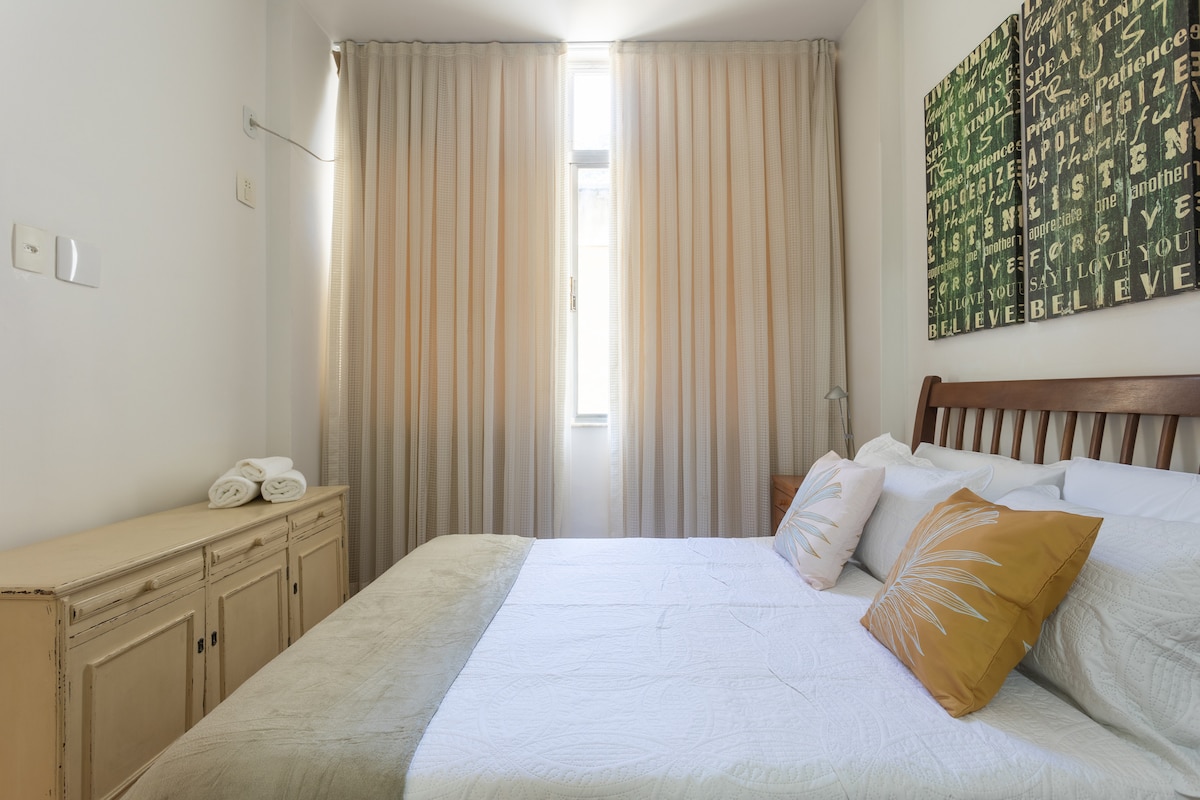 Boho chic style apartment, on the Copacabana beach! - Queen bed, sofa bed, dining table, air conditioning and space for home office (Wifi 300Mbps). Kitchen with stove, refrigerator, oven, microwave, blender, coffee maker, juicer, sandwich maker, pans, kitchen utensils, various books, guitar and TV with apps. - Market and pharmacy under the building, restaurants and shops around the apartment. - Airport at 8.3km - Cristo Redentor at 11.5km - Pão de Açúcar at 2.8km