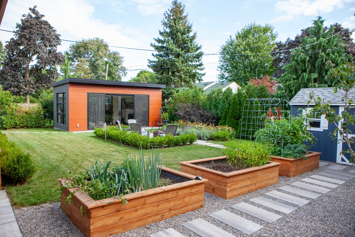 Questo è il livello inferiore della nostra casa. Dispone di 2 patii privati con porte che si affacciano sul giardino e su The Ravine. La suite al piano inferiore della casa dispone di un camino in mattoni a gas e di una cucina completa di tutti gli utensili da cucina. TV da 50 pollici con centinaia di canali e WIFI. Il patio esterno contiene una dinette e un barbecue a gas. Il secondo patio ha sedie Muskoka per godersi il burrone. Sono inclusi una grande sauna in cedro e una lavanderia privata, oltre a un comodo letto matrimoniale e a un letto singolo con ingresso privato