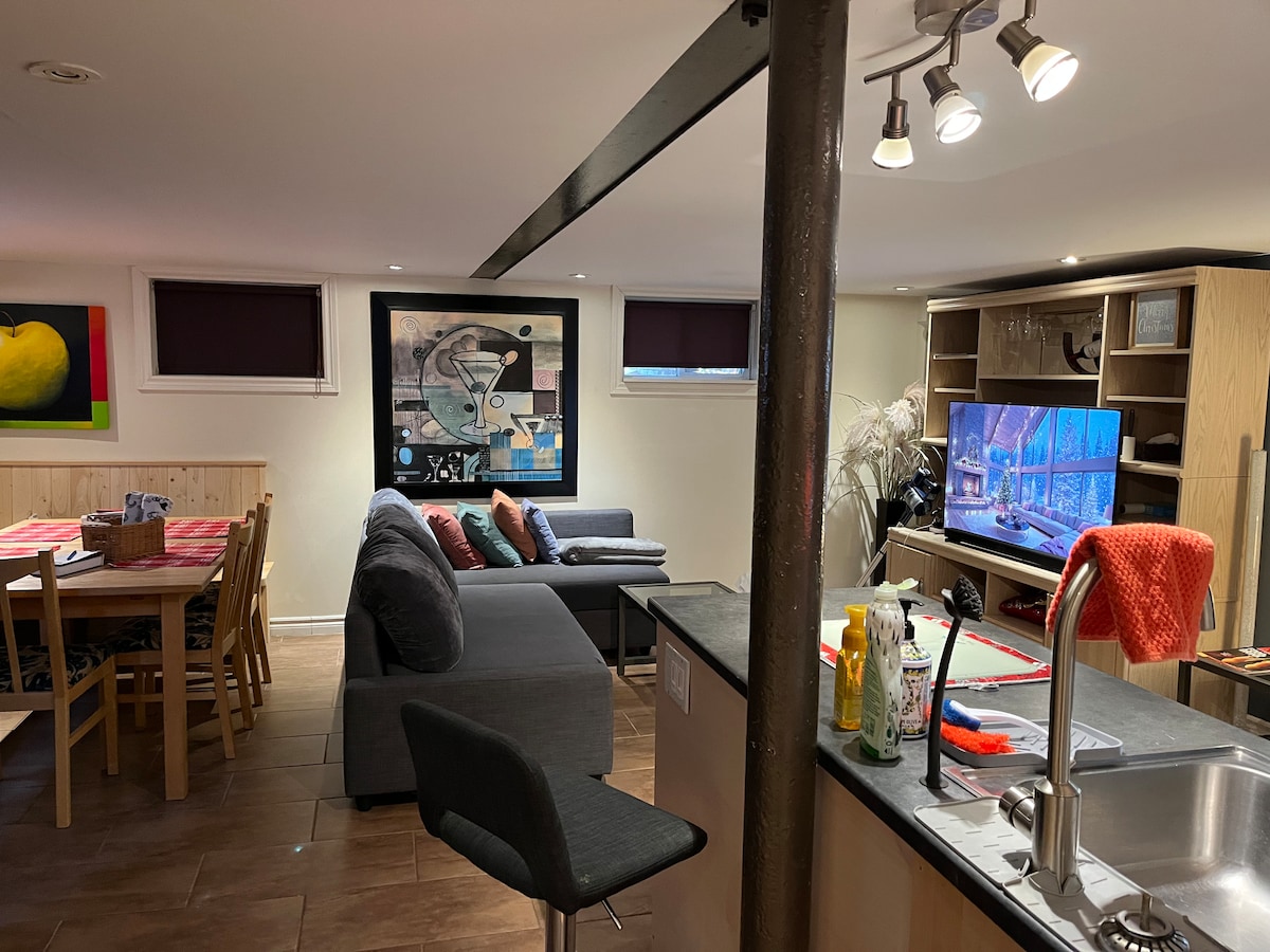 Porta la tua famiglia in questo spazioso alloggio unico per goderti la vacanza. Si tratta di un seminterrato con una cucina completamente attrezzata, che include piano cottura, forno, microonde, bollitore per la preparazione del tè, macchina per il caffè, un divanetto, tavolo da pranzo con sedie, stoviglie e utensili necessari. Una TV è disponibile 24 ore su 24 per vari canali.