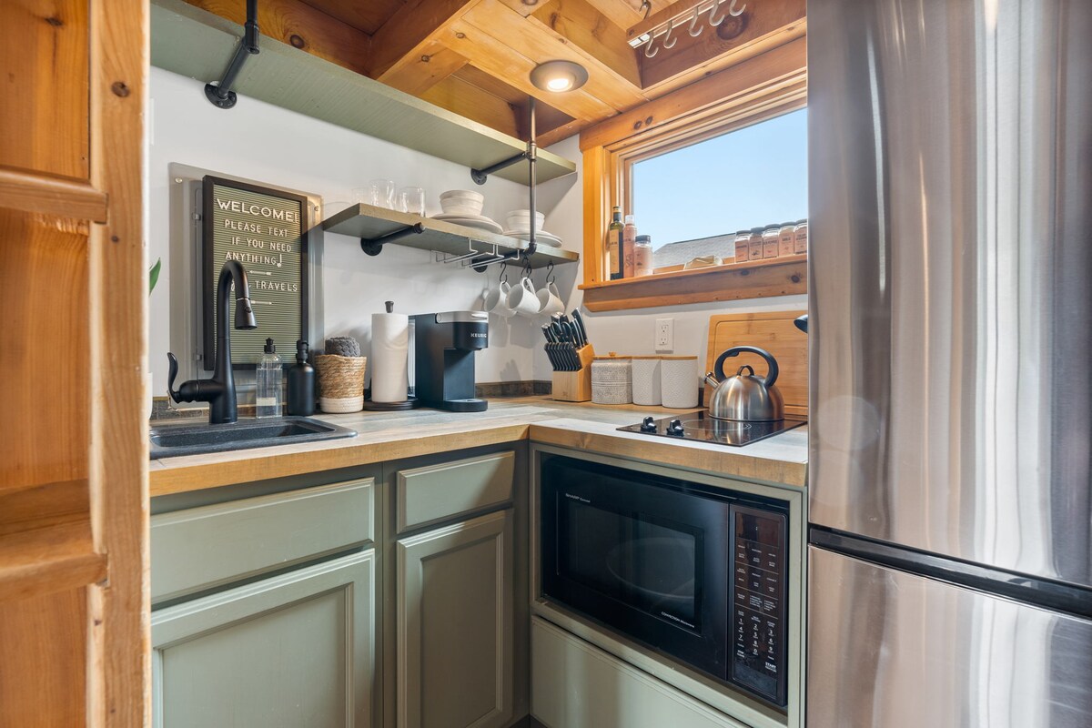 • Perfect for small families or couples, our signature A-Frame cabin features a modern interior gas burning fireplace, soaring ceilings, huge windows, stylish interiors, and all the comforts of home. • This cozy 1,100 square foot space comfortably accommodates up to four guests in two bedrooms (one with a King-size bed and the other with a Queen-size bed) and a shared bathroom. • 7 minute drive to downtown Freeport. • Proud to be ranked in the top 1% and voted Guest Favorite!