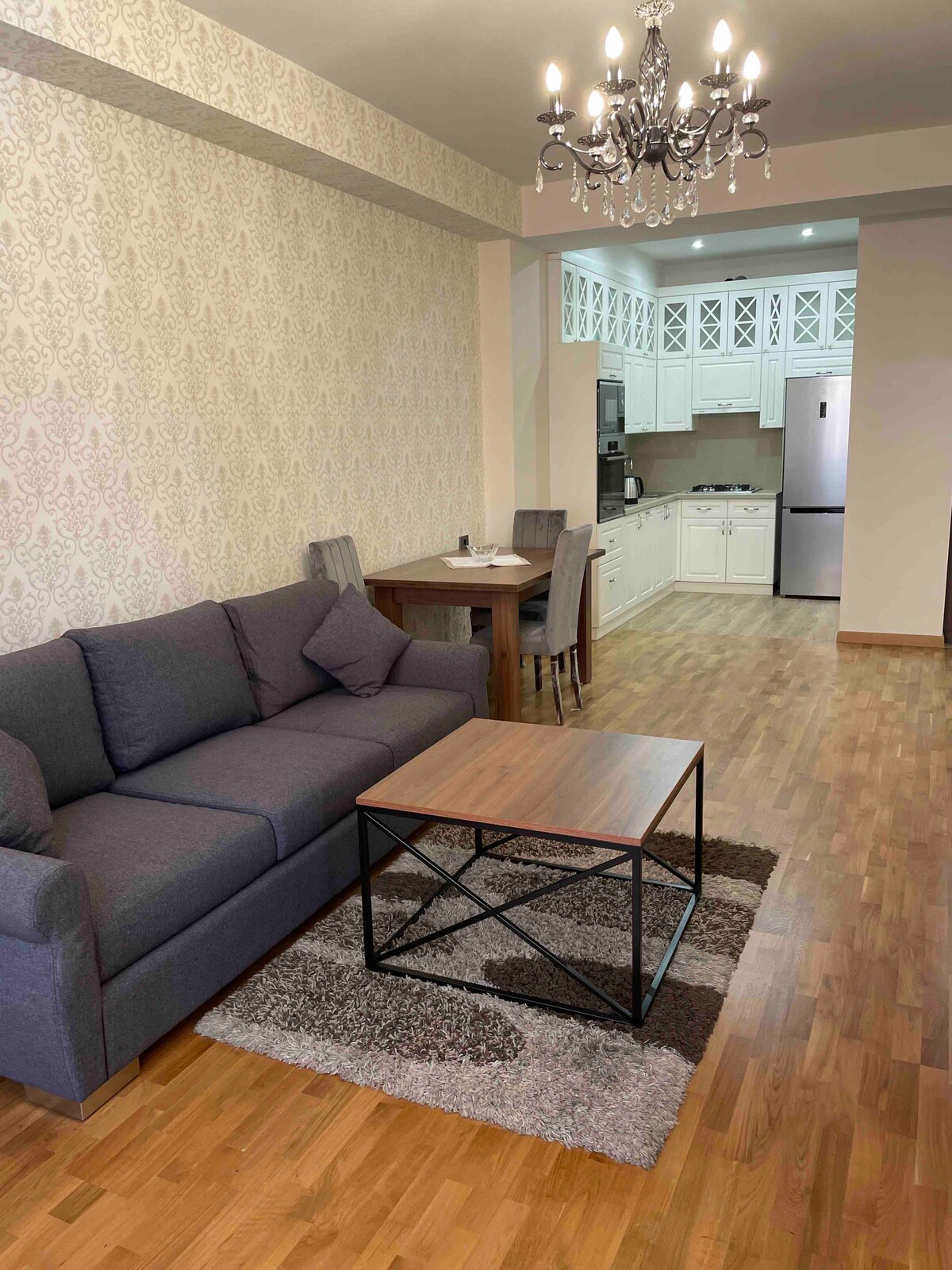 Welcome to Home4you Deluxe Apartment! A brand-new apartment in a recently constructed building featuring two main elevators and a stunning lobby. The building is ideally located in the heart of Yerevan, near Republic Square, and surrounded by a wide variety of restaurants, cafes, shops, and parks. The apartment is fully equipped with everything you need for a perfect vacation or business trip, including air conditioning, Wi-Fi, cable TV, microwave, washing machine, and more.