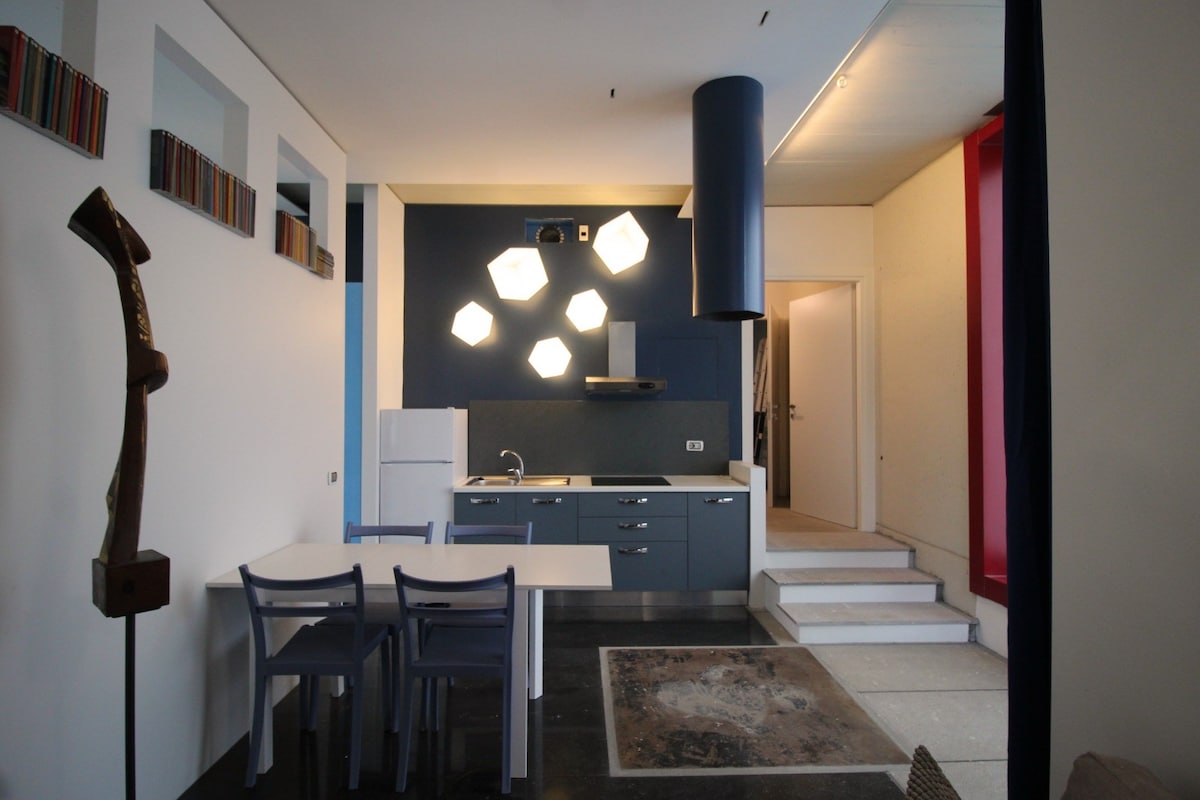 Nuovissimo loft moderno nel centro storico di Rho, a pochi passi dalla stazione ferroviaria FS con cui si raggiunge - con solo 1 fermata di treno: Rho Fieramilano, la metro rossa per Milano Città e l'ospedale Galeazzi (in 3 min.) Il centro di Milano si raggiunge facilmente in 20 minuti di auto o in treno Situato in una corte d'epoca, in una zona fornita di ristoranti, bar e negozi. Super accessoriato. Arredato finemente con pezzi di ceramica pugliese.